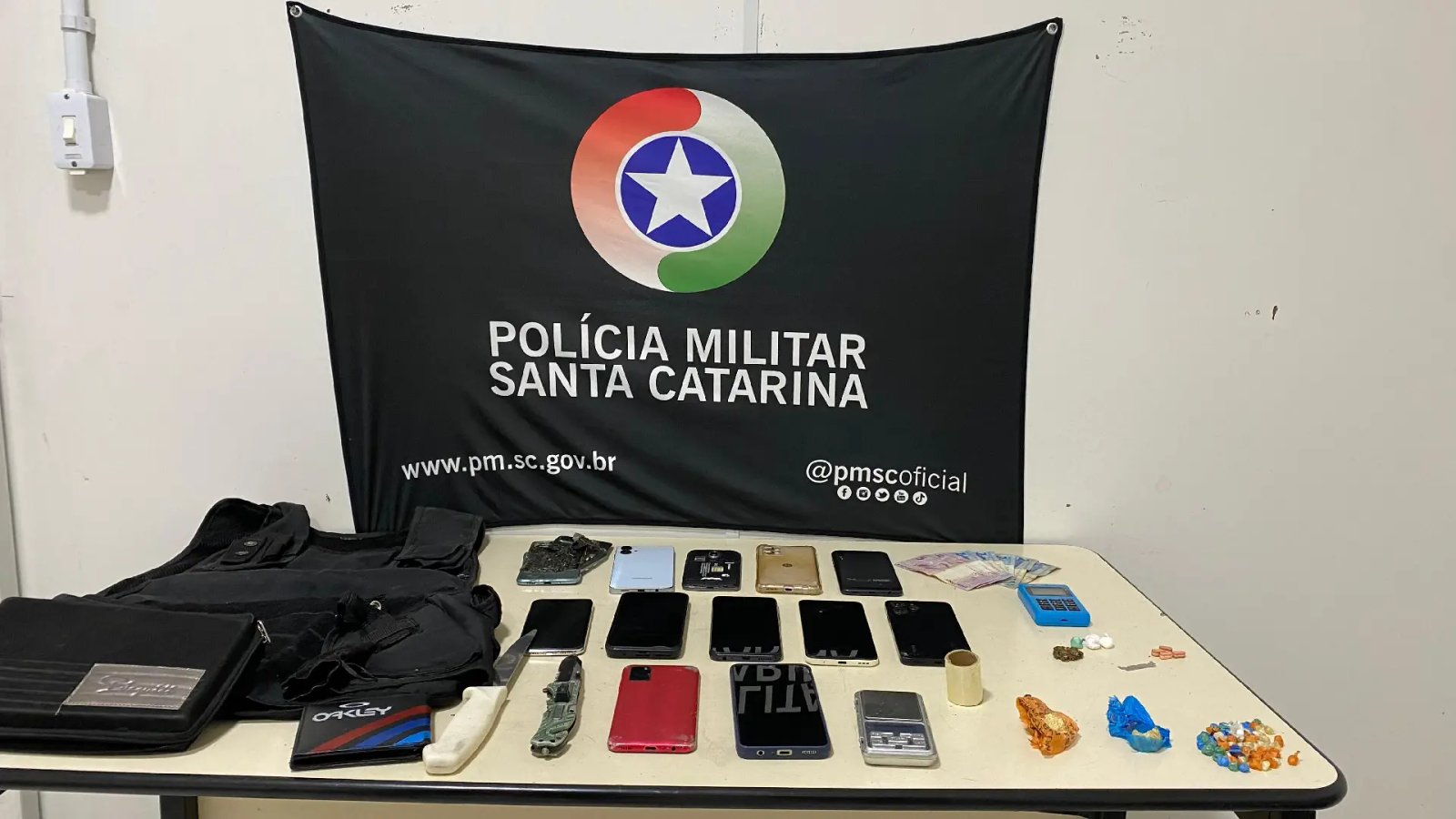 Durante a abordagem, os policiais avistaram um adolescente de 16 anos quebrando aparelhos celulares e os jogando em uma área de mata próxima. Após ser abordado, foi confirmado que os aparelhos haviam sido roubados durante a madrugada em duas ocorrências contra motoristas de aplicativo, uma na cidade de Pomerode e outra em Indaial.