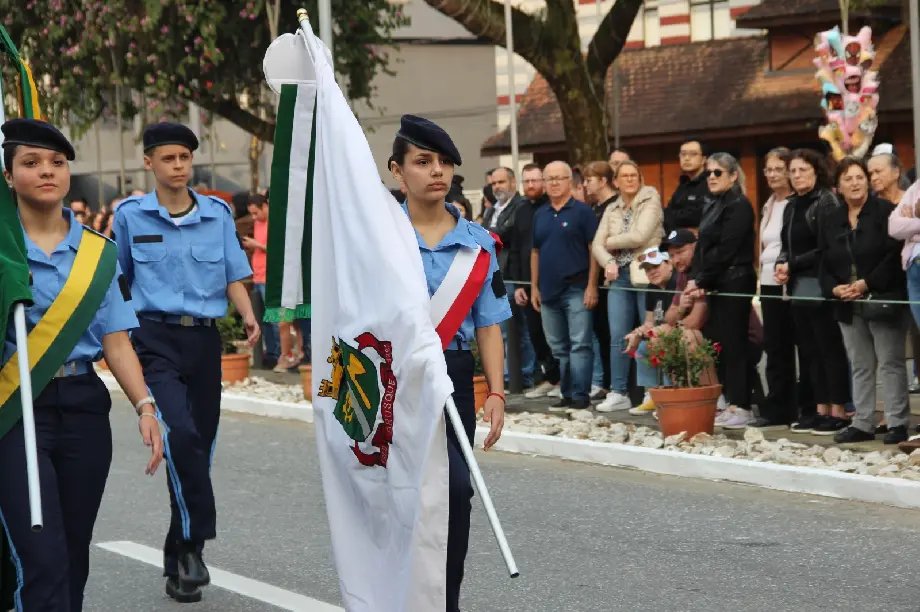 "Devido às instabilidades climáticas e à previsão de chuva para segunda-feira (4), data inicialmente prevista para o desfile cívico em comemoração aos 165 anos de Brusque, a gestão municipal decidiu antecipar o desfile para domingo (3).