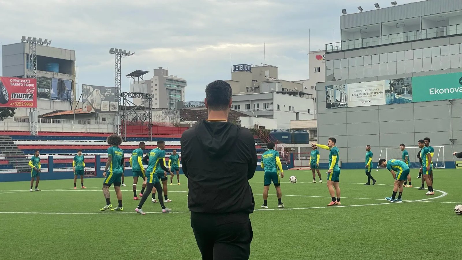 A atividade foi voltada para situações específicas de jogo, com ajustes de posicionamento, movimentações ensaiadas e estratégias tanto ofensivas quanto defensivas em escanteios, faltas laterais e cobranças frontais.