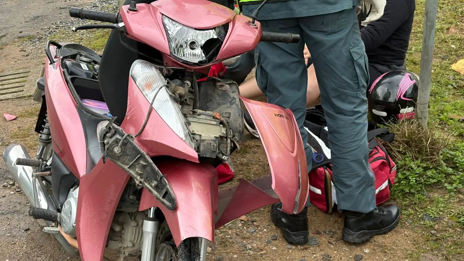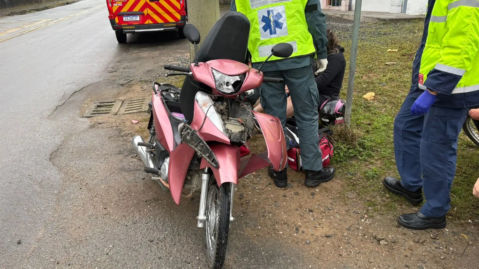 As fotos anexadas à matéria mostram os bombeiros prestando atendimento e a moto com a parte da frente danificada.
