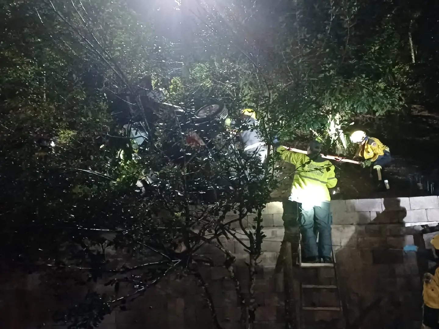 O motorista não estava preso às ferragens, mas não conseguia sair do carro devido à posição em que o veículo parou. Com a chegada da equipe, foi feita a estabilização e a retirada segura do condutor. Ele estava consciente, orientado e relatava dores no joelho e nas costas.