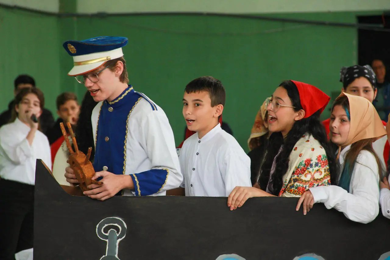 Diversas turmas da escola aceitaram o desafio de protagonizar, por meio de um teatro interativo, o processo de chegada das famílias italianas e as dificuldades enfrentadas no caminho até o Brasil.