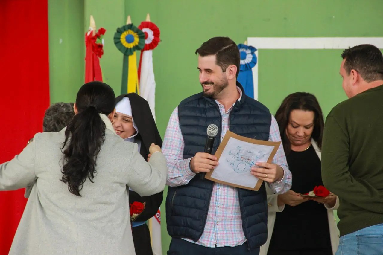 “Hoje, aqui na Escola Paquetá, fizeram uma verdadeira festa de aniversário, por assim dizer, porque foi algo muito bonito. Sempre é gratificante estar aqui, vendo os valores que estão sendo ensinados às crianças por meio do Programa Cívico-Militar. Além disso, elas também nos ensinaram algo. A nossa região é rica em cultura italiana, alemã e polonesa. E, com certeza, conhecer um pouco da história dos imigrantes italianos que vieram para cá, ajudaram a colonizar e formaram as raízes da terra que temos hoje, é fundamental”, disse o vice-prefeito Deco Battisti.