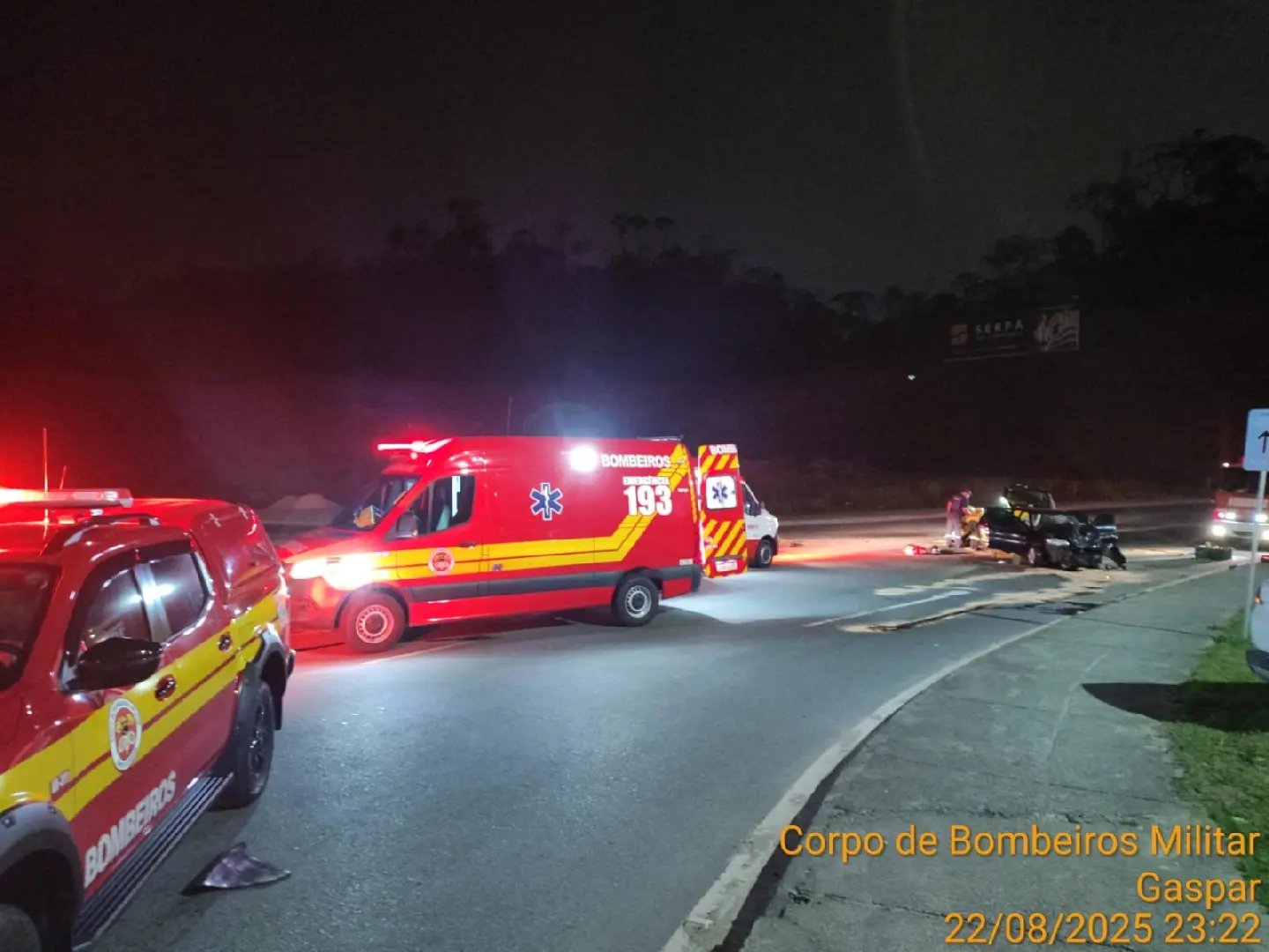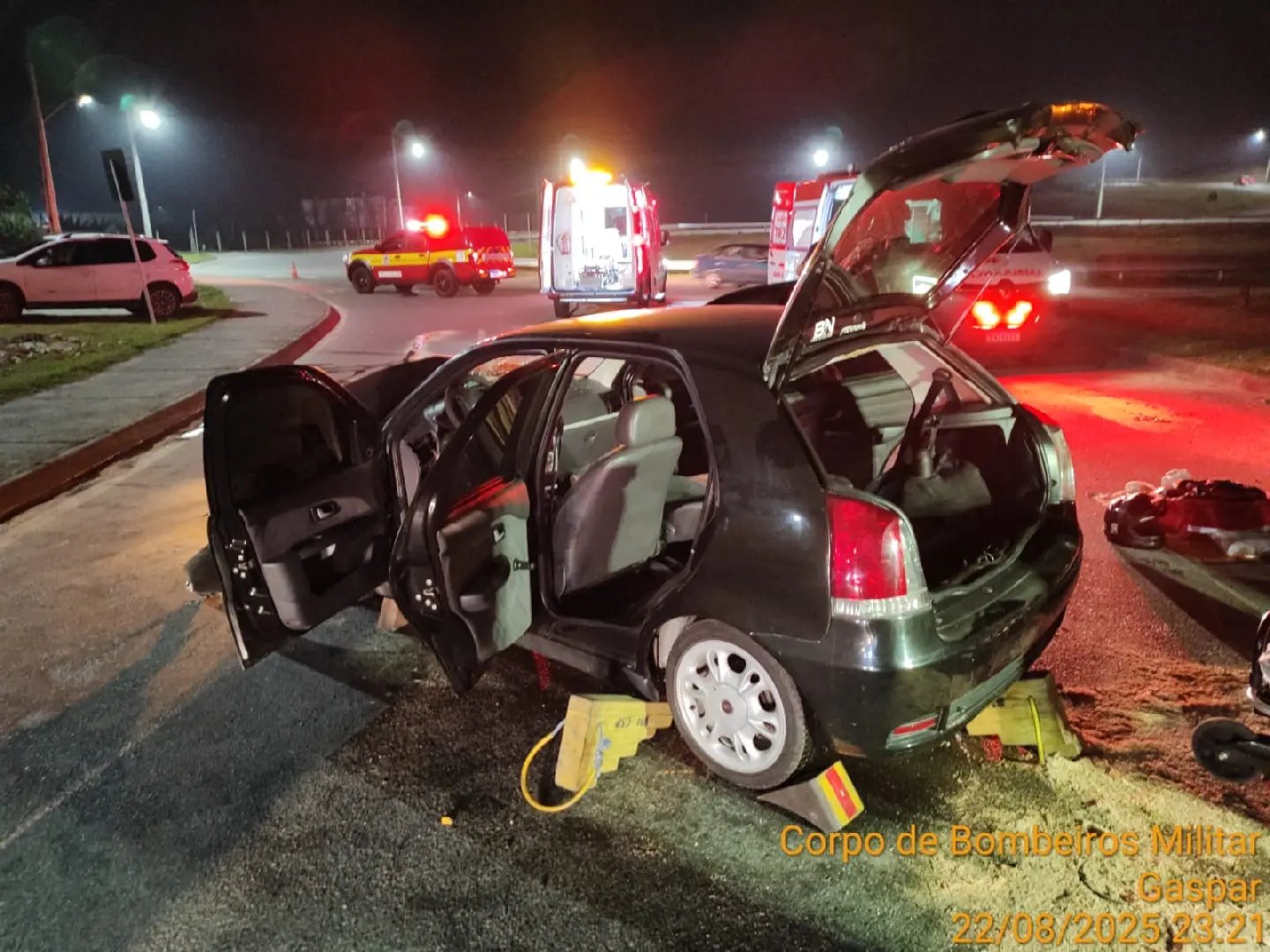 Na noite desta sexta-feira (22), por volta das 23h01, o Corpo de Bombeiros Militar de Gaspar foi acionado para atender um acidente de trânsito envolvendo um automóvel e uma carreta. A colisão ocorreu na rotatória de acesso entre a rua Pedro Simon e a Ponte do Vale.