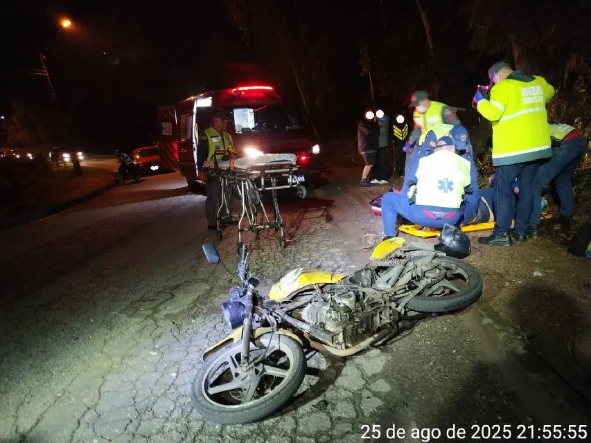 As guarnições foram chamadas ao local por volta das 21h36. No endereço, encontraram o condutor da moto caído no chão, às margens da via e lúcido. Ele, condutor de uma Dafra Speed 150, tinha uma suspeita de fratura no pé e na perna esquerda, com ferimento perfurante na área.