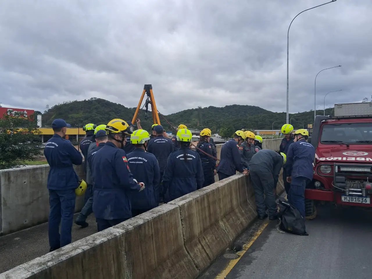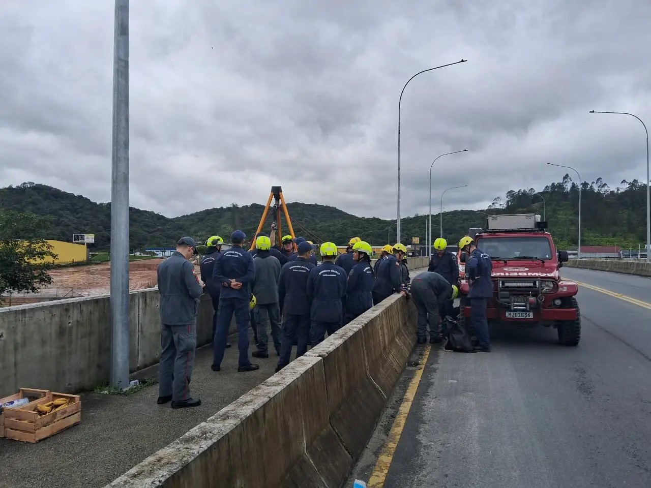 A 3ª Companhia de Bombeiros Militar de Brusque realizou, na tarde desta quarta-feira (27), um simulado de treinamento de salvamento em altura na Ponte Arquiteta Andrea Patrícia Volkmann, conhecida como “ponte amarela”, próxima ao pavilhão da Fenarreco. A atividade faz parte da capacitação contínua da corporação e envolveu bombeiros de diferentes cidades da região.