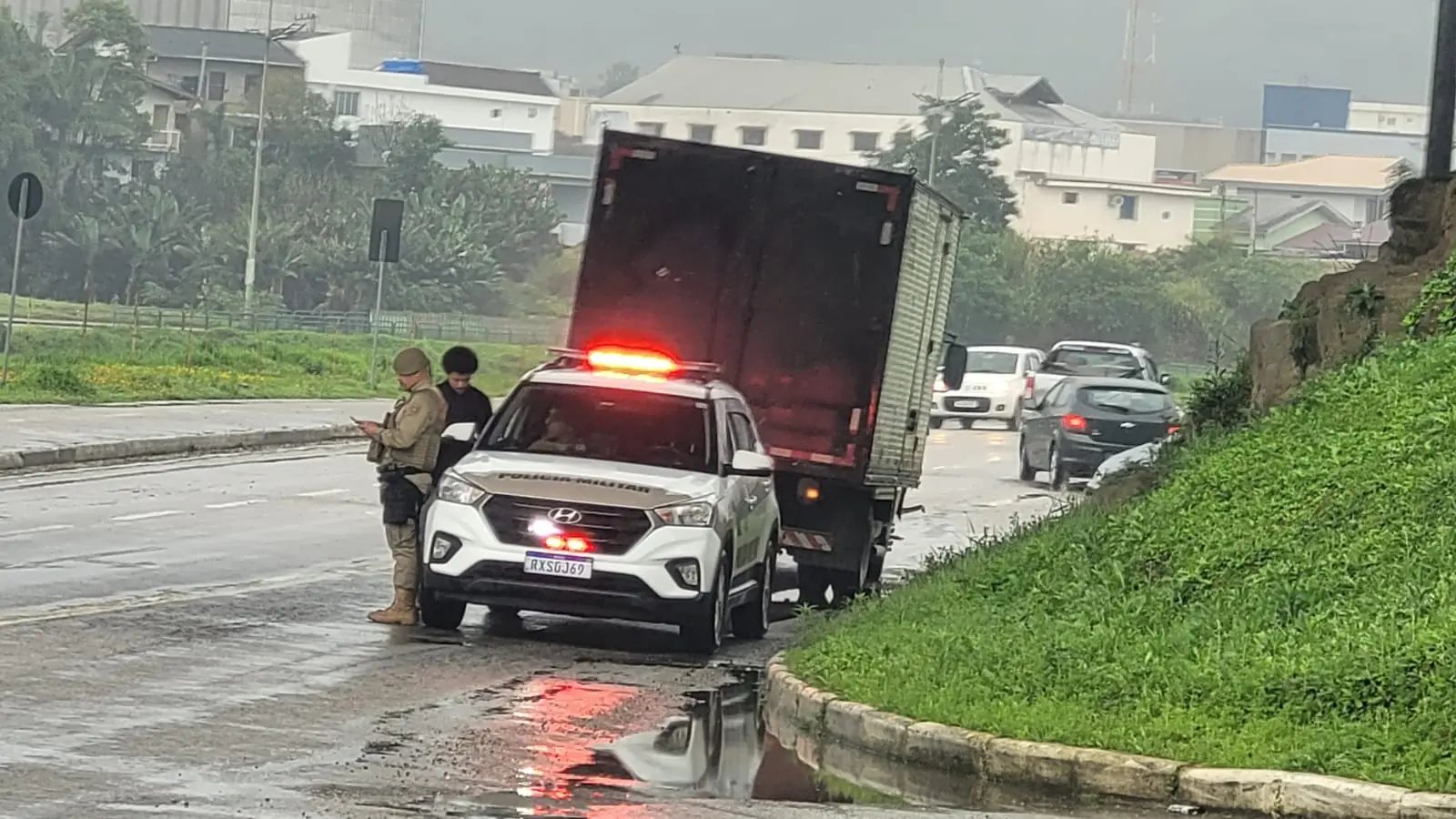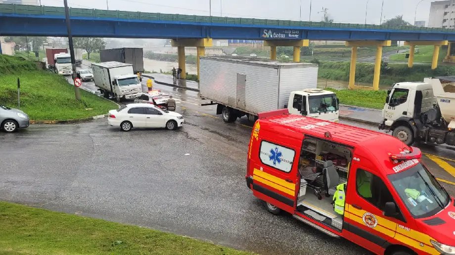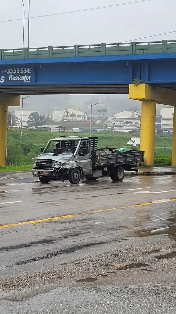 Segundo relatos, o caminhão de pequeno porte saía da rua Vitor Meirelles quando foi atingido na lateral por outro veículo de carga que seguia no sentido Centro para bairro.