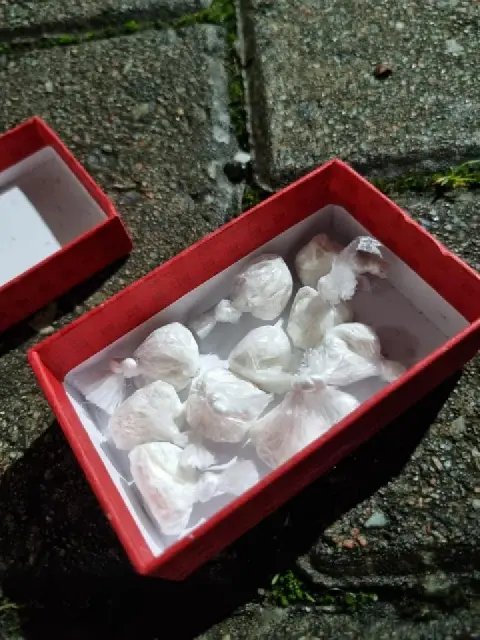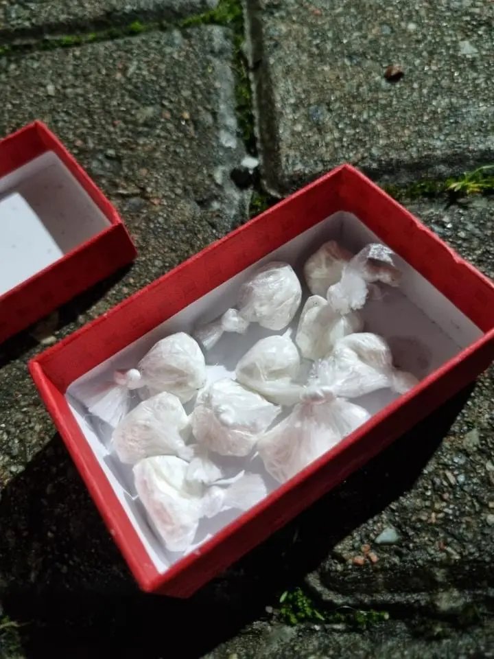 A guarnição do Canil da Polícia Militar foi acionada em apoio e localizou o objeto. A caixa se abriu ao atingir o solo, revelando dez invólucros de cocaína, cada um com aproximadamente 10 gramas.