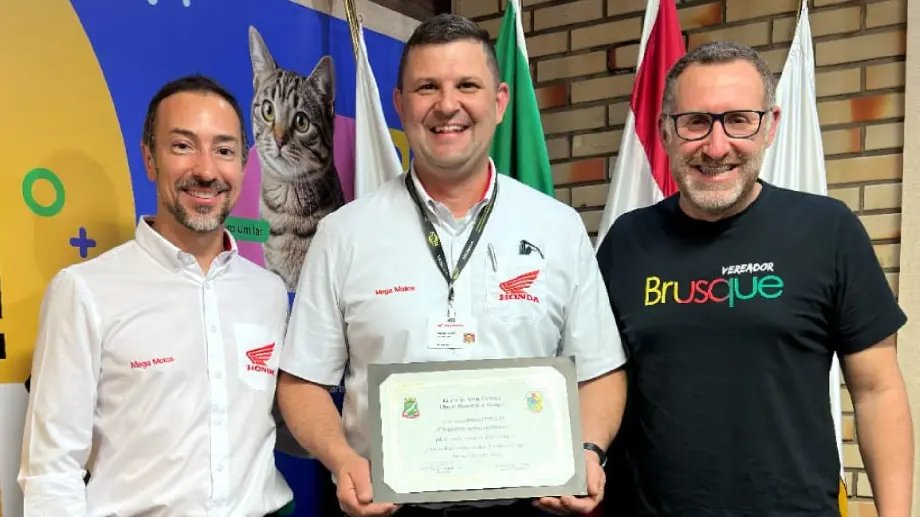 A Câmara de Vereadores de Brusque concedeu, na terça-feira (9), a Comenda Mérito Profissional ao gerente geral da Mega Motos, Maicon Bertolini, 42 anos, em reconhecimento à sua trajetória marcada pela dedicação ao setor automotivo e ao serviço voluntário. A homenagem foi proposta pelo vereador Paulinho Sestrem (PL).