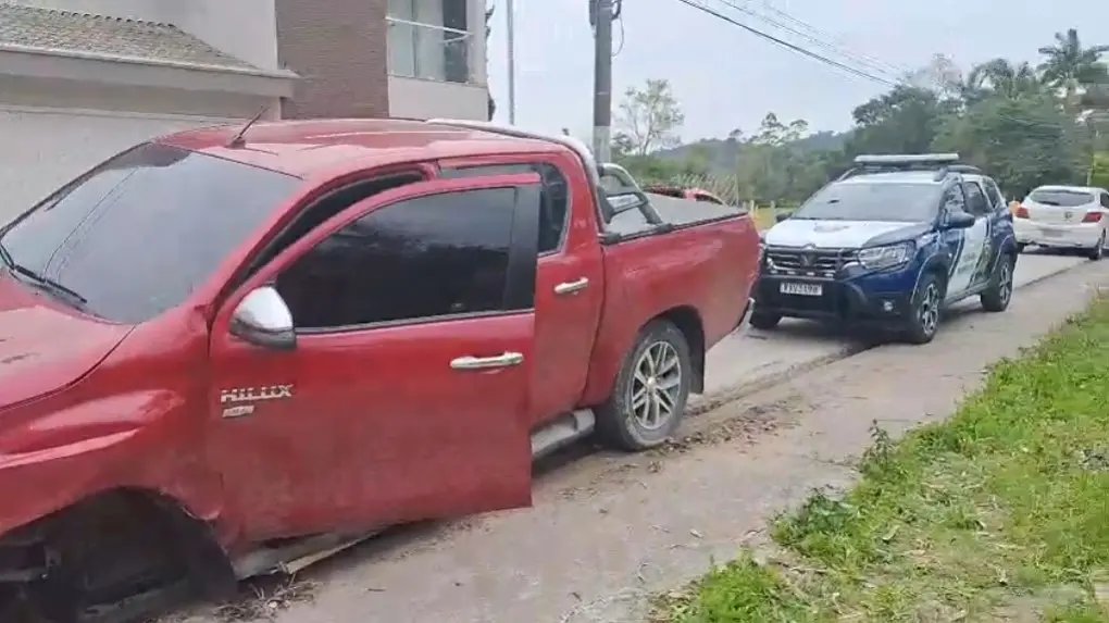 Um furto de uma caminhonete Toyota Hilux vermelha mobilizou a Guarda Municipal de Itajaí e a Polícia Militar de Brusque na manhã desta sexta-feira (12), por volta das 9h. O veículo havia sido furtado no bairro das Nações, em Balneário Camboriú, e a ocorrência se estendeu até Brusque, após uma perseguição que terminou com a prisão dos dois suspeitos na mata. O proprietário da caminhonete registrou o boletim de ocorrência logo após o crime.