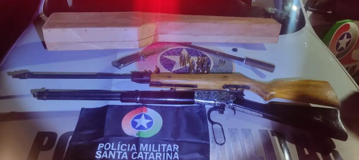 No local, os policiais encontraram uma espingarda carabina calibre 38 em posse do homem. Durante as buscas, foram apreendidas ainda duas facas que estavam jogadas na sala, uma espingarda de pressão adaptada para calibre 22 e munições de diversos calibres.