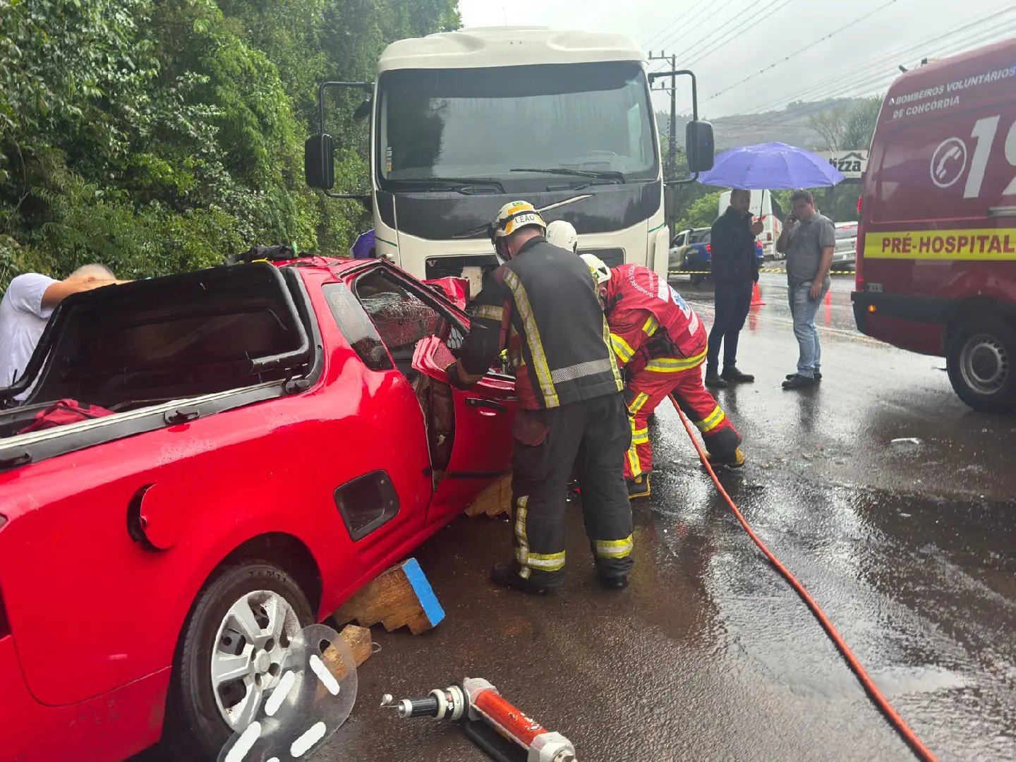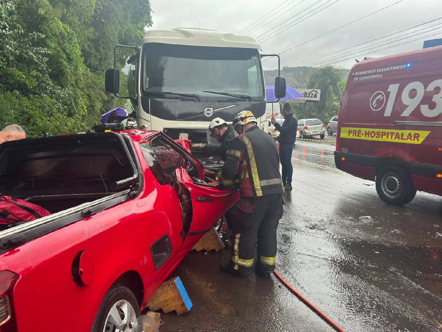 Segundo informações divulgadas pela Rádio Atual FM de Concórdia, o motorista do utilitário ficou preso às ferragens e precisou ser retirado pela equipe do Corpo de Bombeiros, que utilizou ferramentas hidráulicas para ter acesso à vítima. Ele apresentava ferimentos nas pernas e braços, recebendo atendimento de uma equipe do Suporte Avançado do SAMU ainda no local.