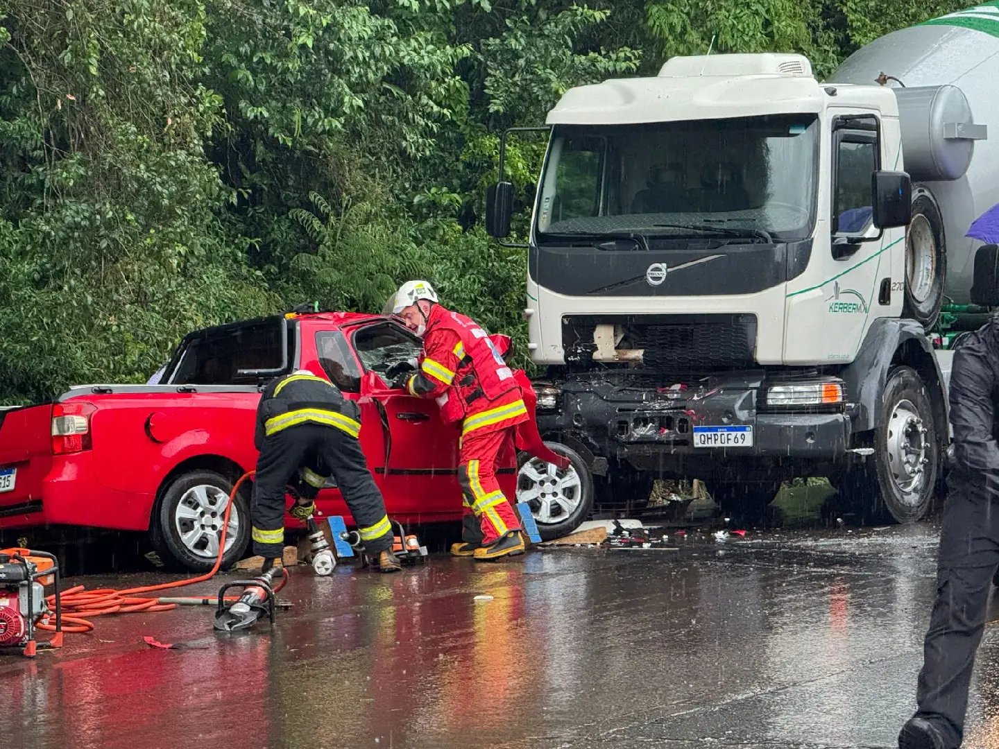 Um grave acidente foi registrado no início da tarde desta terça-feira (30), envolvendo um GM/Montana e um caminhão utilizado para transporte de concreto. A colisão aconteceu na SC-283, nas proximidades do bairro Fragosos, em Concórdia.