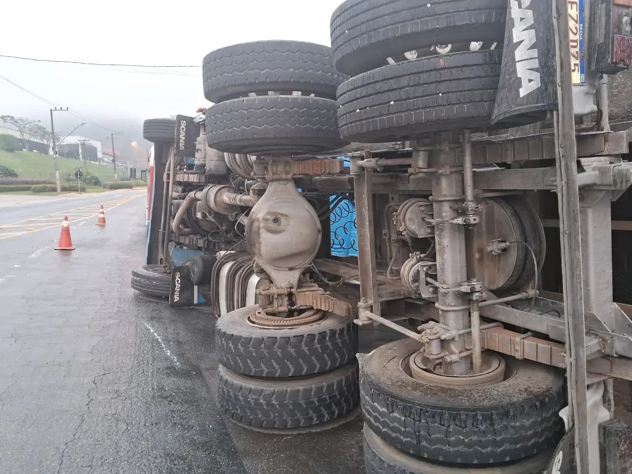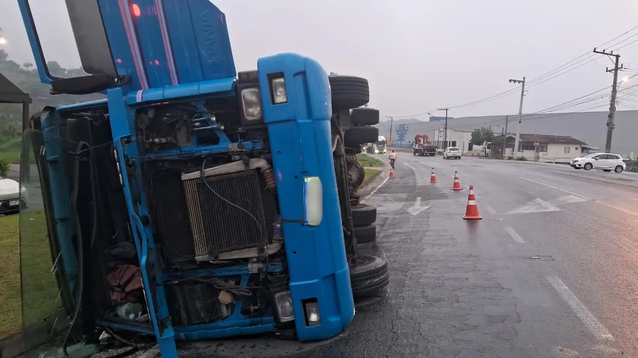 Um caminhão-contêiner tombou na manhã desta segunda-feira (6), na Rodovia Ivo Silveira, no bairro Bateas, em Brusque. O fato aconteceu por volta das 06h, momento em que o Corpo de Bombeiros registrou a ocorrência.