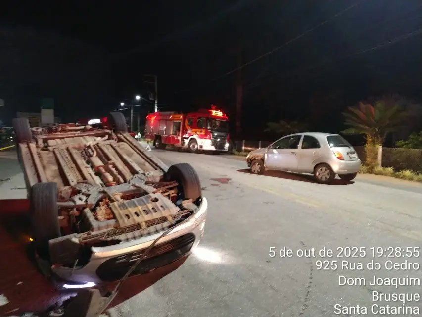 Dois veículos se envolveram em um acidente, um deles capotou e três pessoas ficaram feridas na noite deste domingo (5), no bairro Dom Joaquim, em Brusque. A ocorrência foi registrada por volta das 19h, na Avenida Dom Joaquim, e precisou do apoio do Corpo de Bombeiros, Samu e da Polícia Militar Rodoviária (PMRv).
