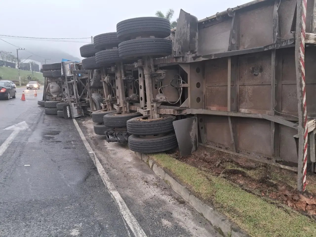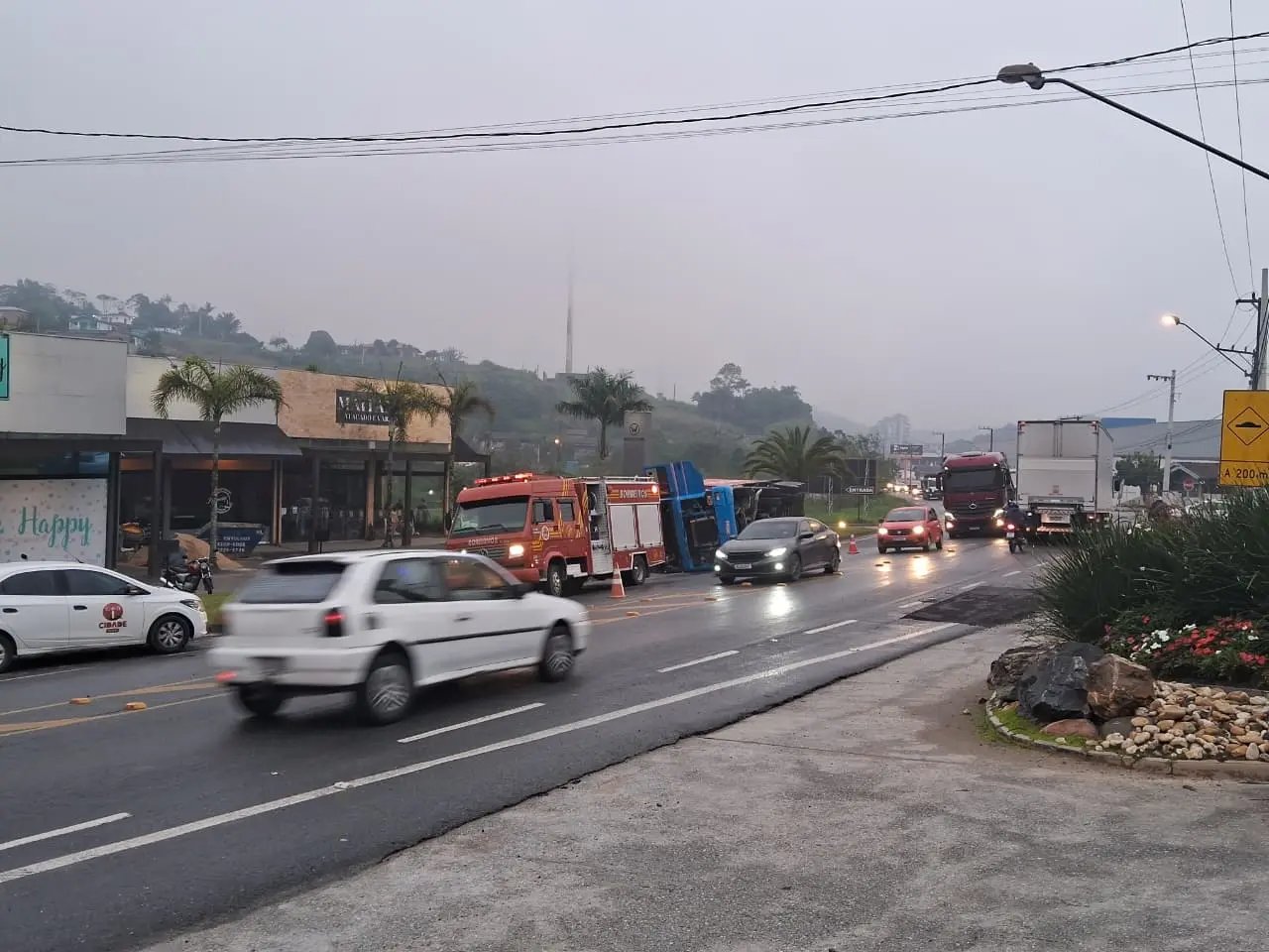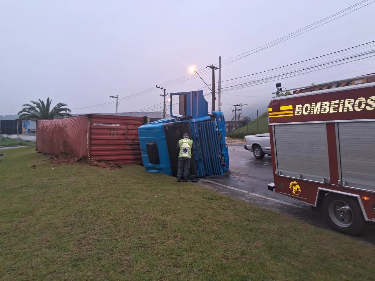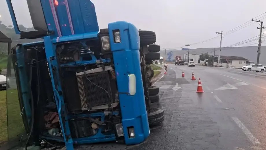 O Corpo de Bombeiros de Brusque atualizou as informações sobre o caminhão-contêiner que tombou na manhã desta segunda-feira (6) na Rodovia Ivo Silveira, no bairro Bateas.