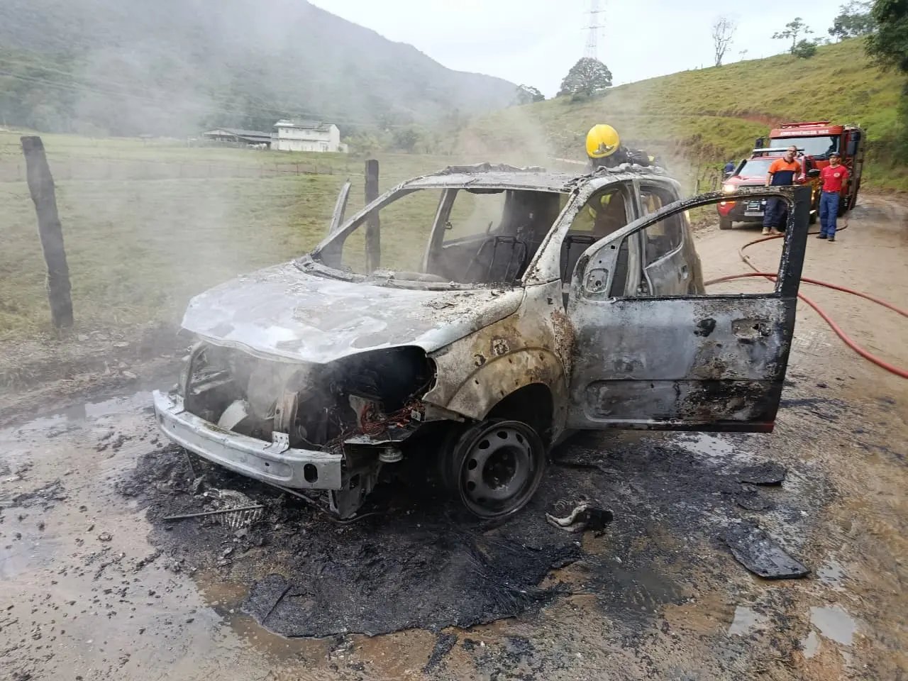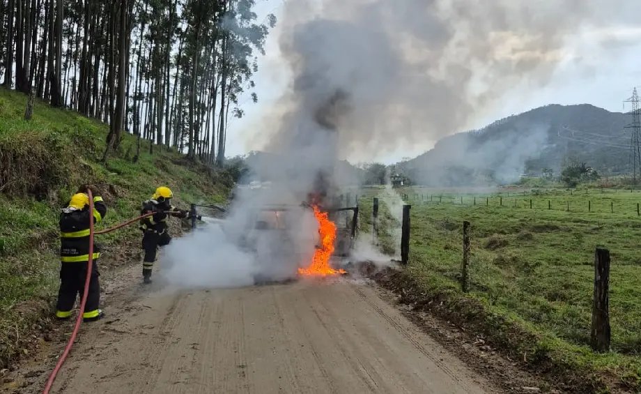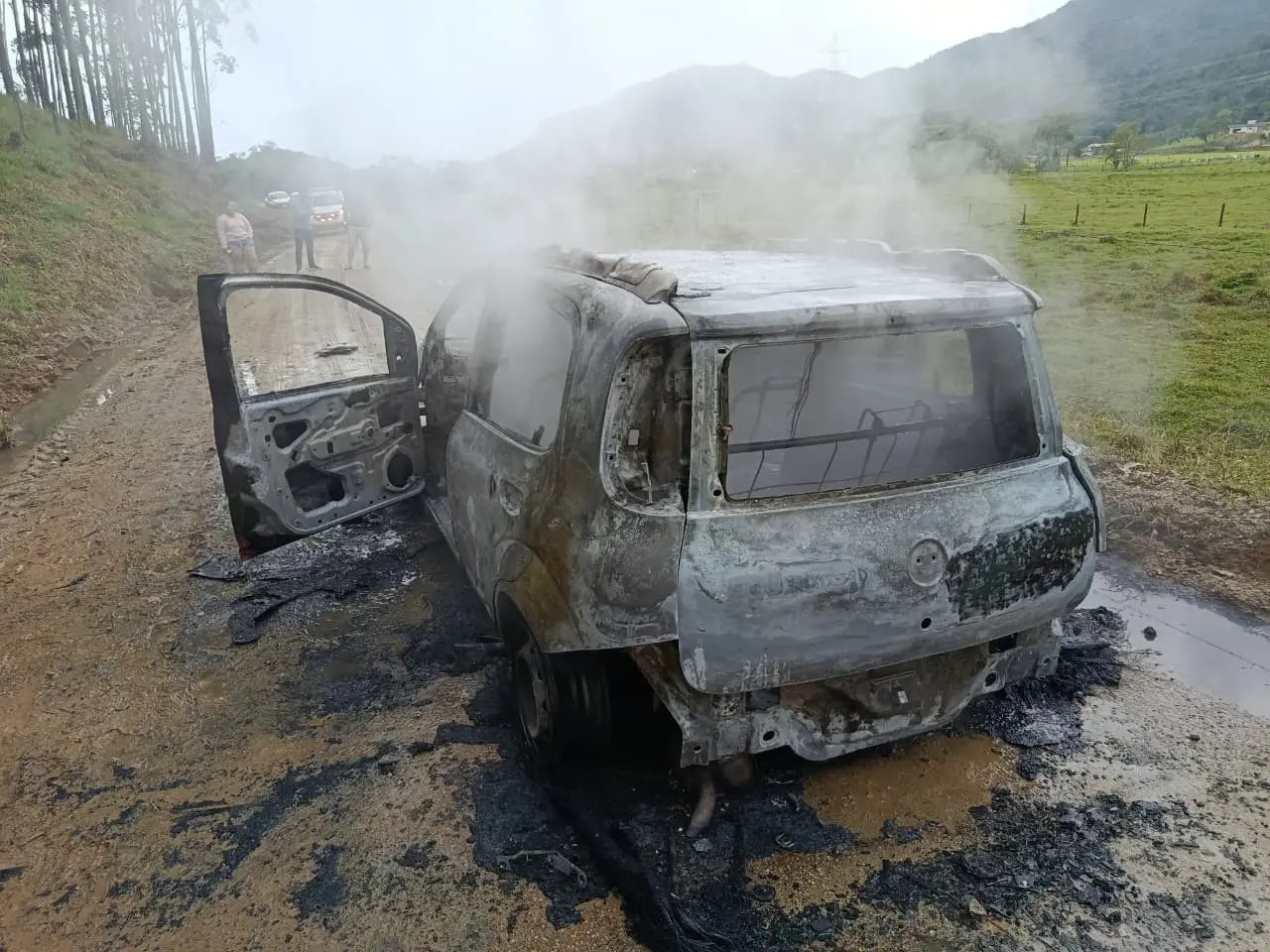 Um carro ficou completamente destruído após pegar fogo na manhã desta quinta-feira (9), depois de apresentar uma falha mecânica e incendiar na parte dianteira. O veículo, um Fiat Uno Way, foi totalmente consumido pelas chamas na Estrada da Palha, localidade de Macacos, em Camboriú.