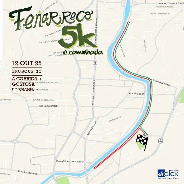 O trânsito na região da Arena Multiuso será interditado a partir das 5h da manhã deste domingo (12) para a realização da Corrida Fenarreco 5K. O evento, organizado pela Squadra di Alex Eventos Esportivos, integra a programação oficial da tradicional festa brusquense e reunirá corredores e caminhantes em percursos de 3 km e 5 km, além de uma caminhada de 3 km.