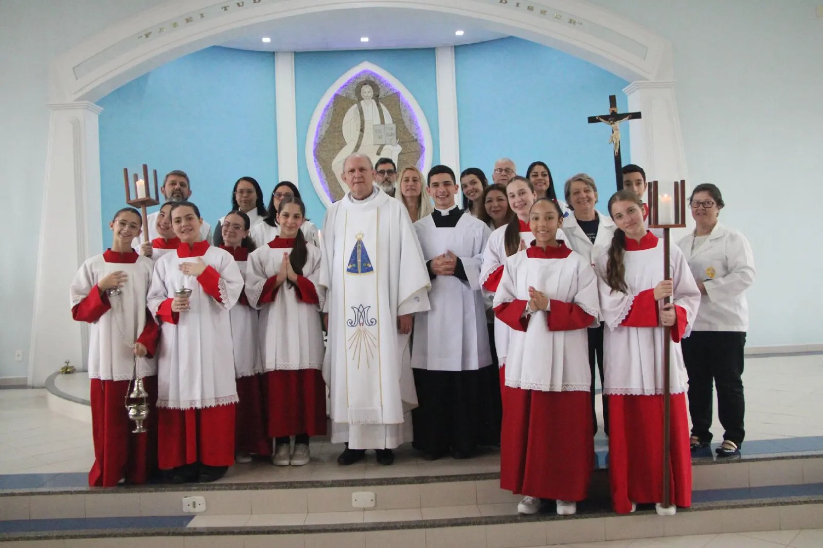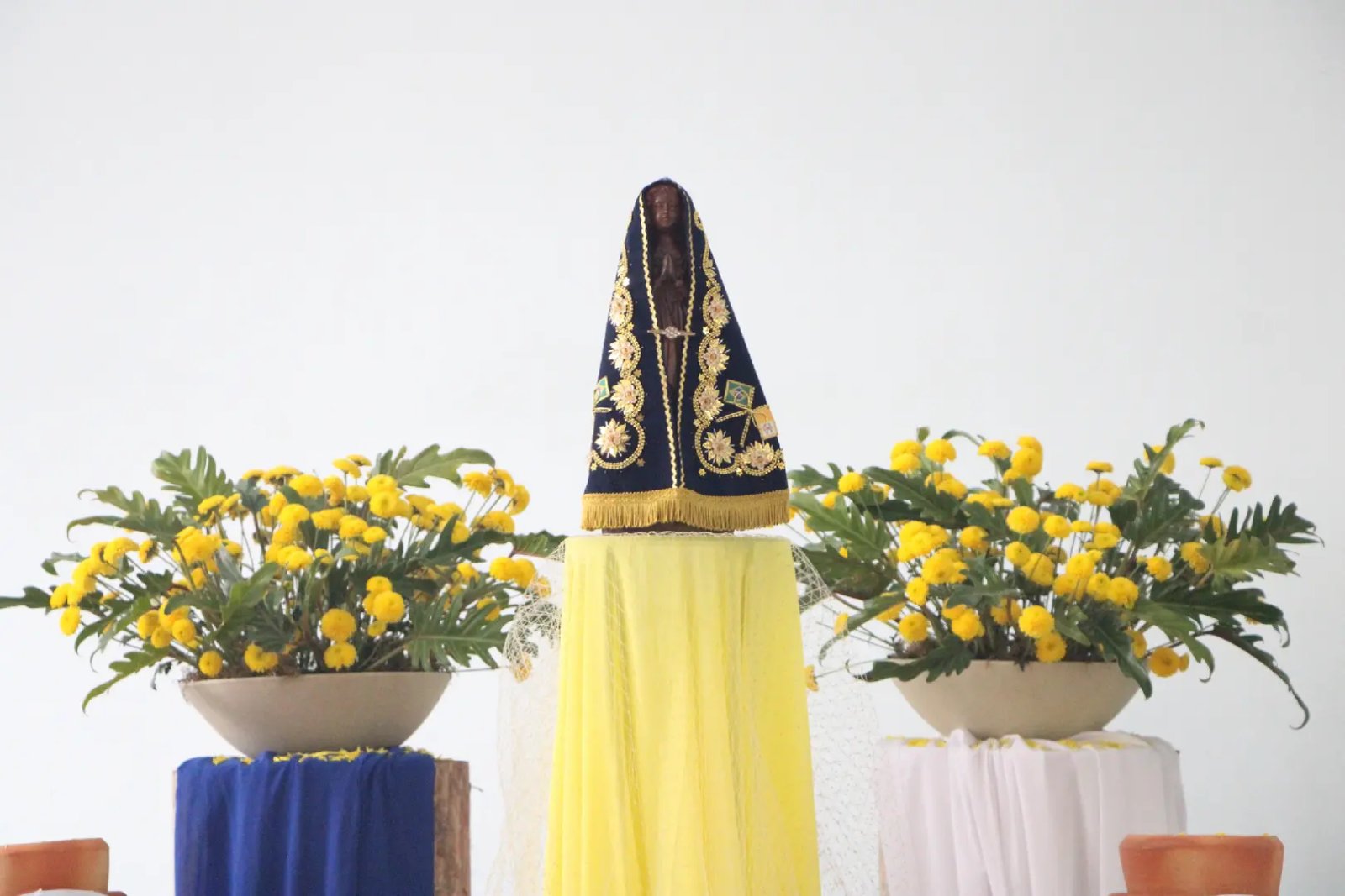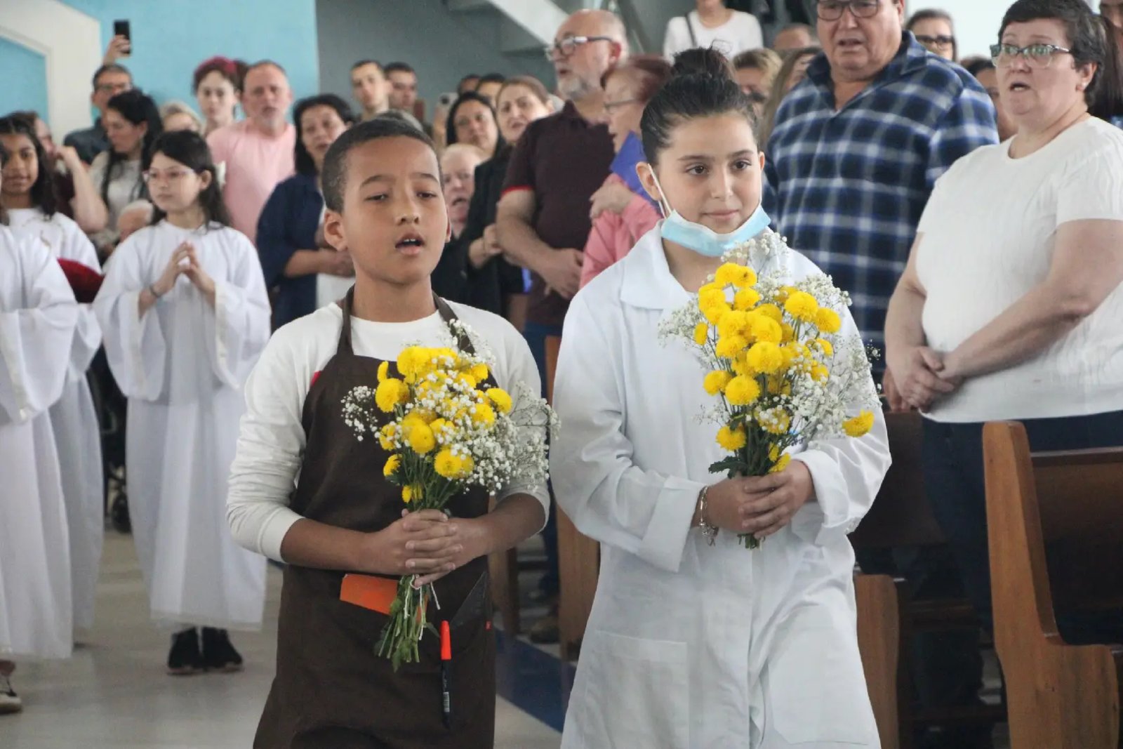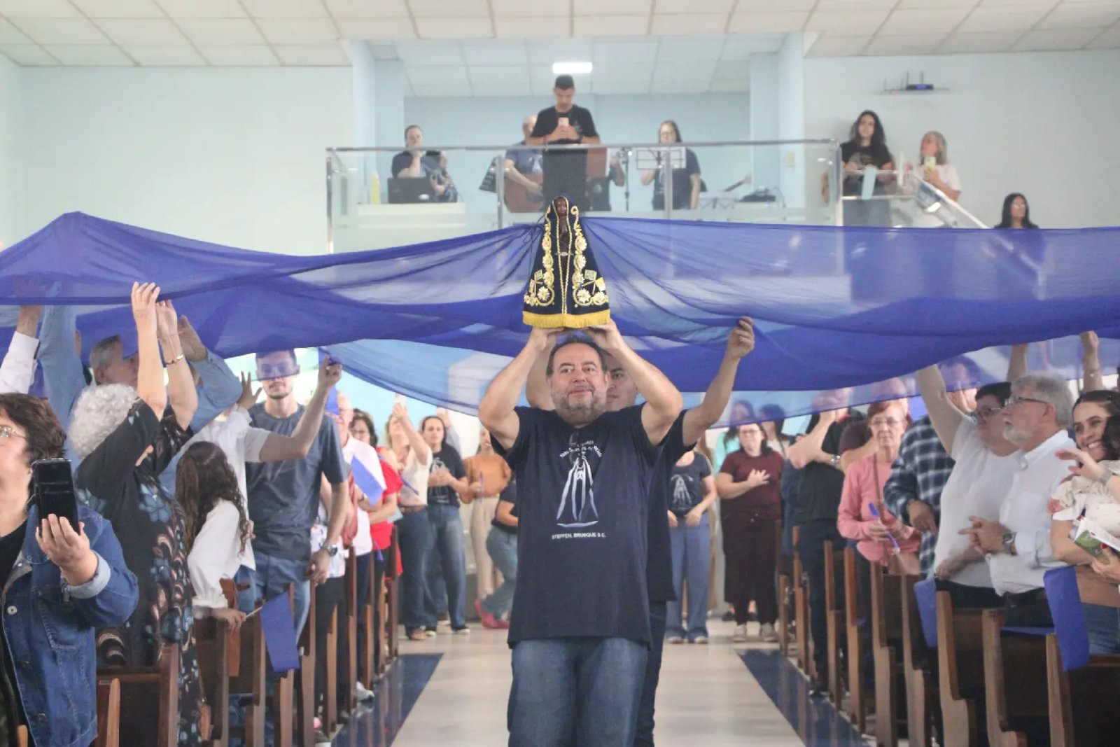 Durante a celebração, a imagem de Nossa Senhora Aparecida percorreu o corredor central da igreja com um manto estendido sobre os devotos e, ao final, foi coroada pelas crianças da catequese.