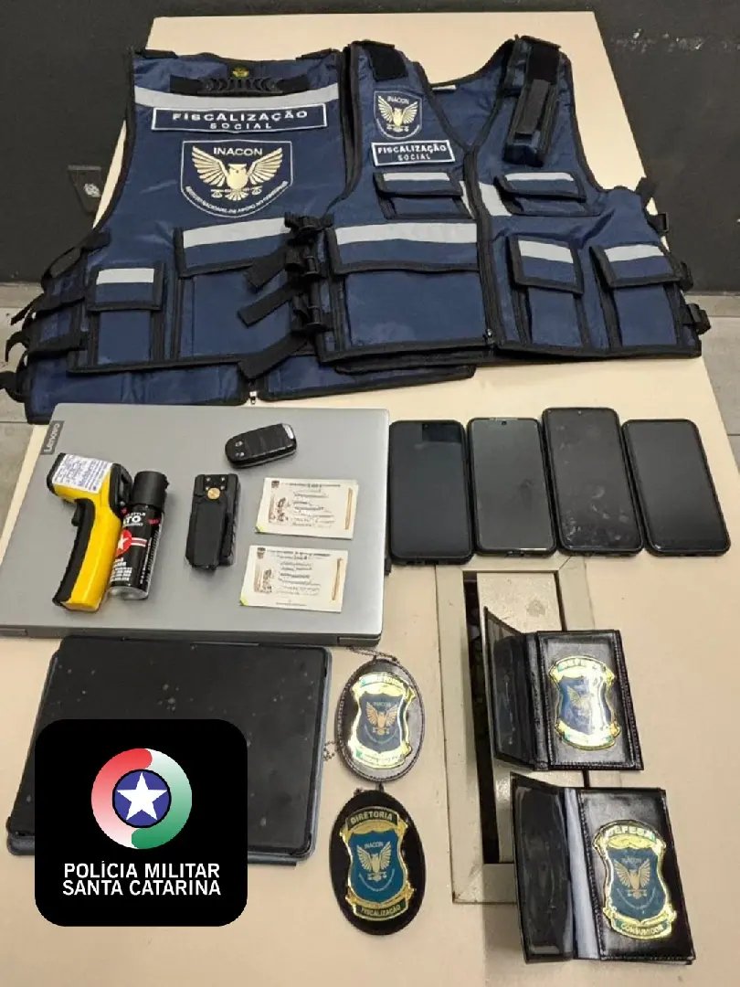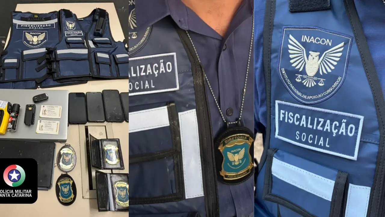 De acordo com a PM, os suspeitos circulavam em um Jeep Compass plotado e equipado com giroflex, o que dava aparência de viatura oficial. Eles se apresentavam como fiscais de um suposto órgão chamado INACON (Instituto Nacional de Apoio ao Consumidor) e realizavam “fiscalizações” em estabelecimentos comerciais, alegando irregularidades e coagindo comerciantes a comprar cursos para evitar multas.