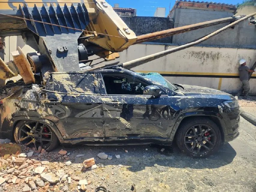 Durante a ocorrência, os bombeiros precisaram arrombar o vidro da porta do caroneiro do veículo atingido para retirar pertences pessoais do proprietário. Após as medidas de segurança e a contenção inicial, o local ficou sob responsabilidade dos donos da máquina e do automóvel, além da Defesa Civil, que segue monitorando a área para evitar novos incidentes.