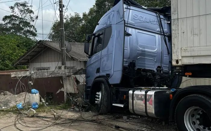 De acordo com informações do Corpo de Bombeiros, o caminhão contêiner atropelou uma motocicleta que estava estacionada, derrubou um poste de energia e atingiu três casas antes de parar com a cabine dentro de uma das moradias.