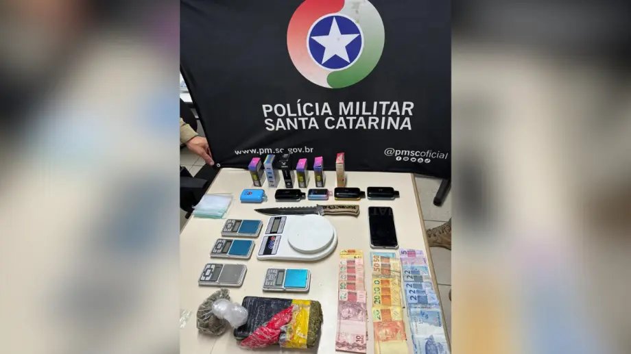 Durante a abordagem, os policiais encontraram e apreenderam aproximadamente 489 gramas de maconha, além de embalagens individuais, uma balança de precisão, uma faca usada para fracionamento, 11 cigarros eletrônicos, R$ 448 em espécie e um aparelho celular.