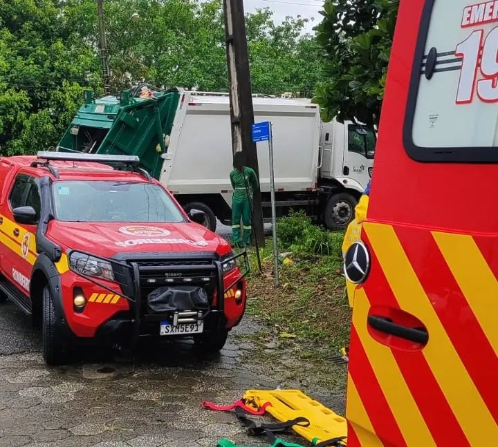 Um gari ficou ferido ao ser prensado por um caminhão que colidiu com um poste enquanto ele trabalhava na tarde deste sábado (18), por volta das 14h16, na rua Canelinha, bairro Santa Terezinha, em Gaspar.