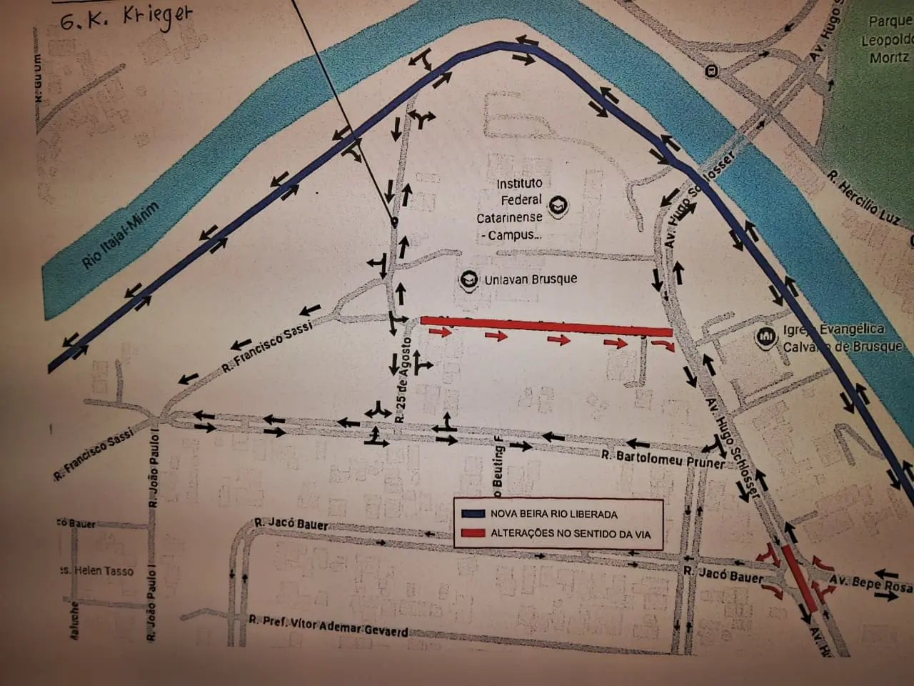 A Prefeitura de Brusque anunciou nesta quinta-feira (23), no Salão Nobre, a liberação do novo trecho da Beira-Rio, sentido Guarani ao Rio Branco. A mudança no trânsito começará a valer a partir das 8h de domingo, com alterações que prometem melhorar a mobilidade e a segurança na região.