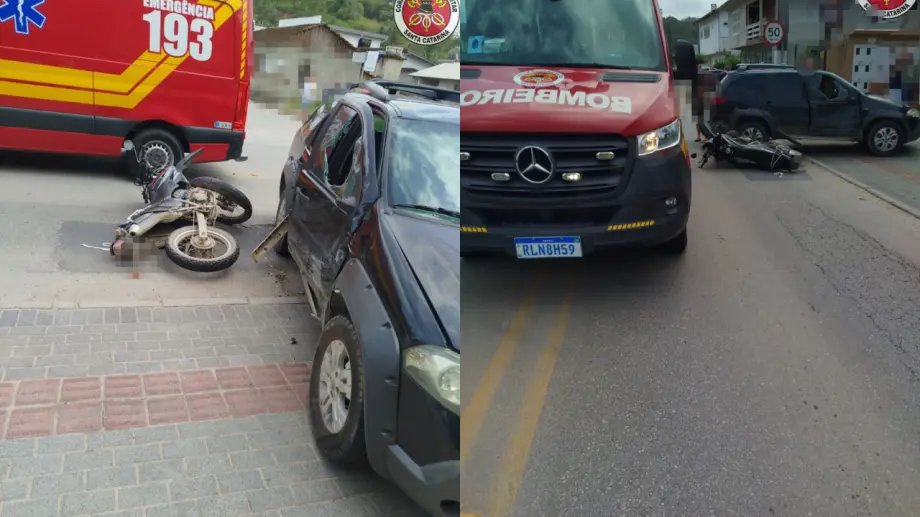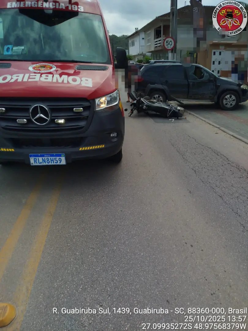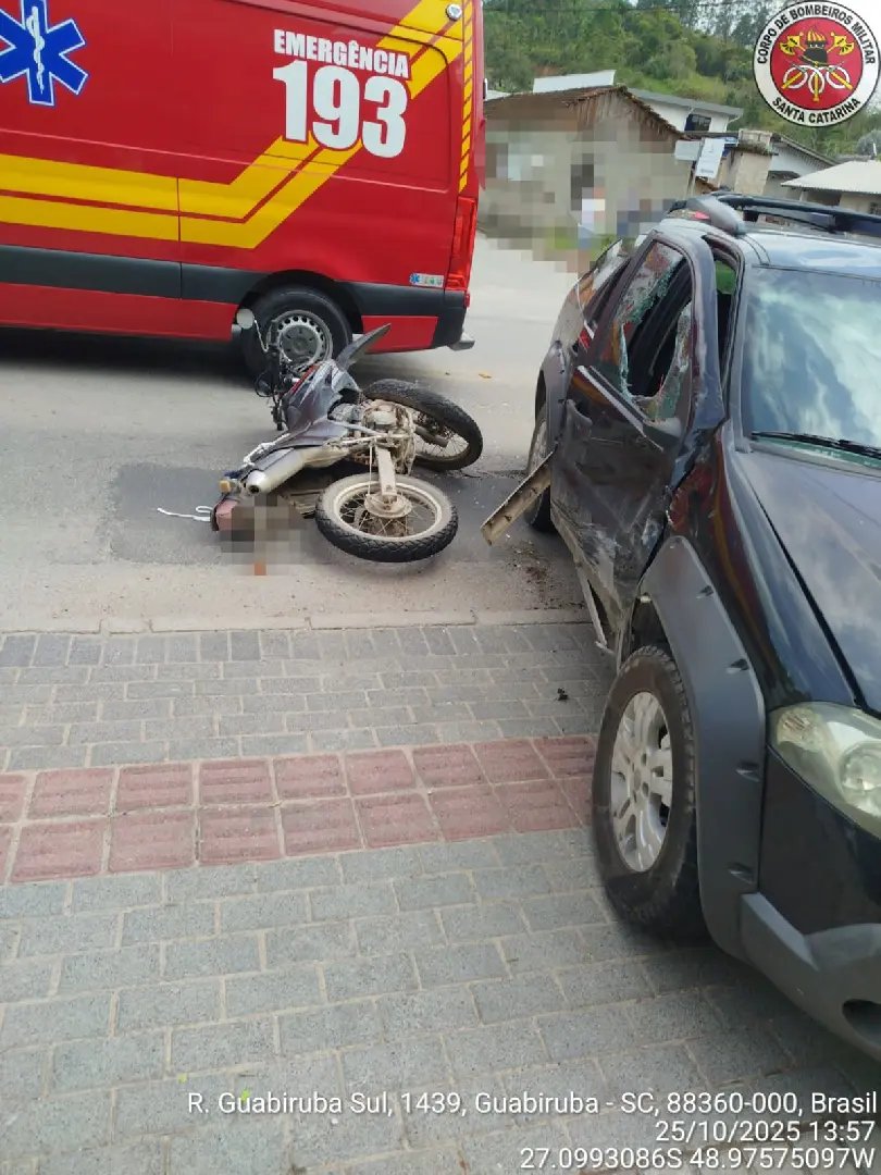 Um motociclista de 42 anos ficou ferido após uma colisão entre carro e moto na Rua Guabiruba Sul, no bairro Guabiruba Sul, em Guabiruba, na tarde deste sábado (25).