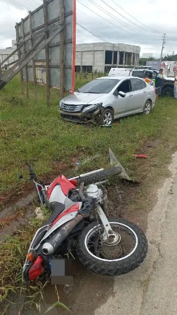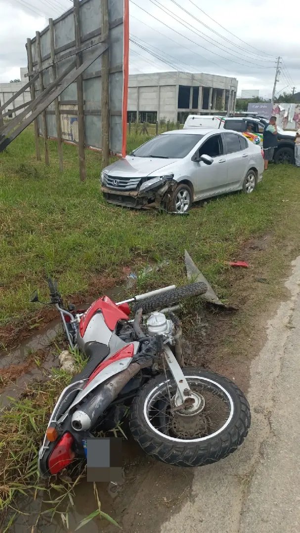 Os veículos tiveram danos significativos: o Honda City sofreu avarias no capô, para-choque, faróis e retrovisor, enquanto a motocicleta teve danos na carenagem, farol, paralamas, guidão e outros componentes.