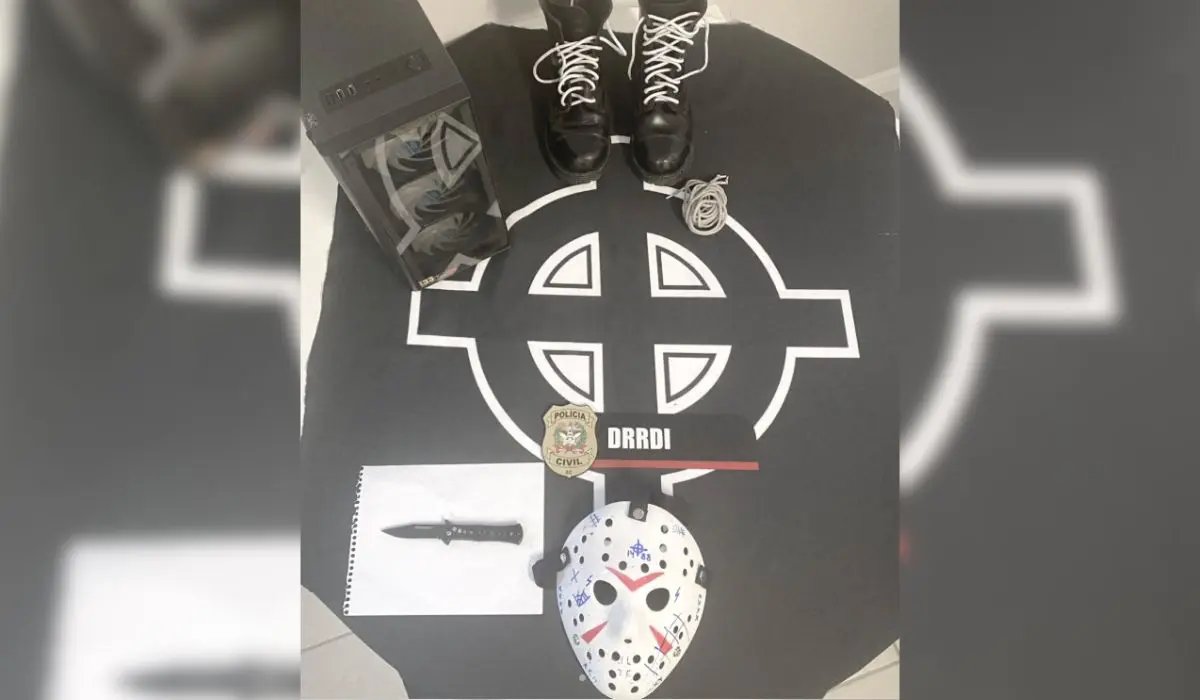 Durante as diligências, foram apreendidos objetos ligados à ideologia nazista, como uma bandeira com a Cruz Celta, utilizada por grupos extremistas, além de desenhos do Sol Negro e da sigla “SS”, em referência à força de repressão do regime nazista alemão. Todo o material foi encaminhado à perícia para dar continuidade às investigações.