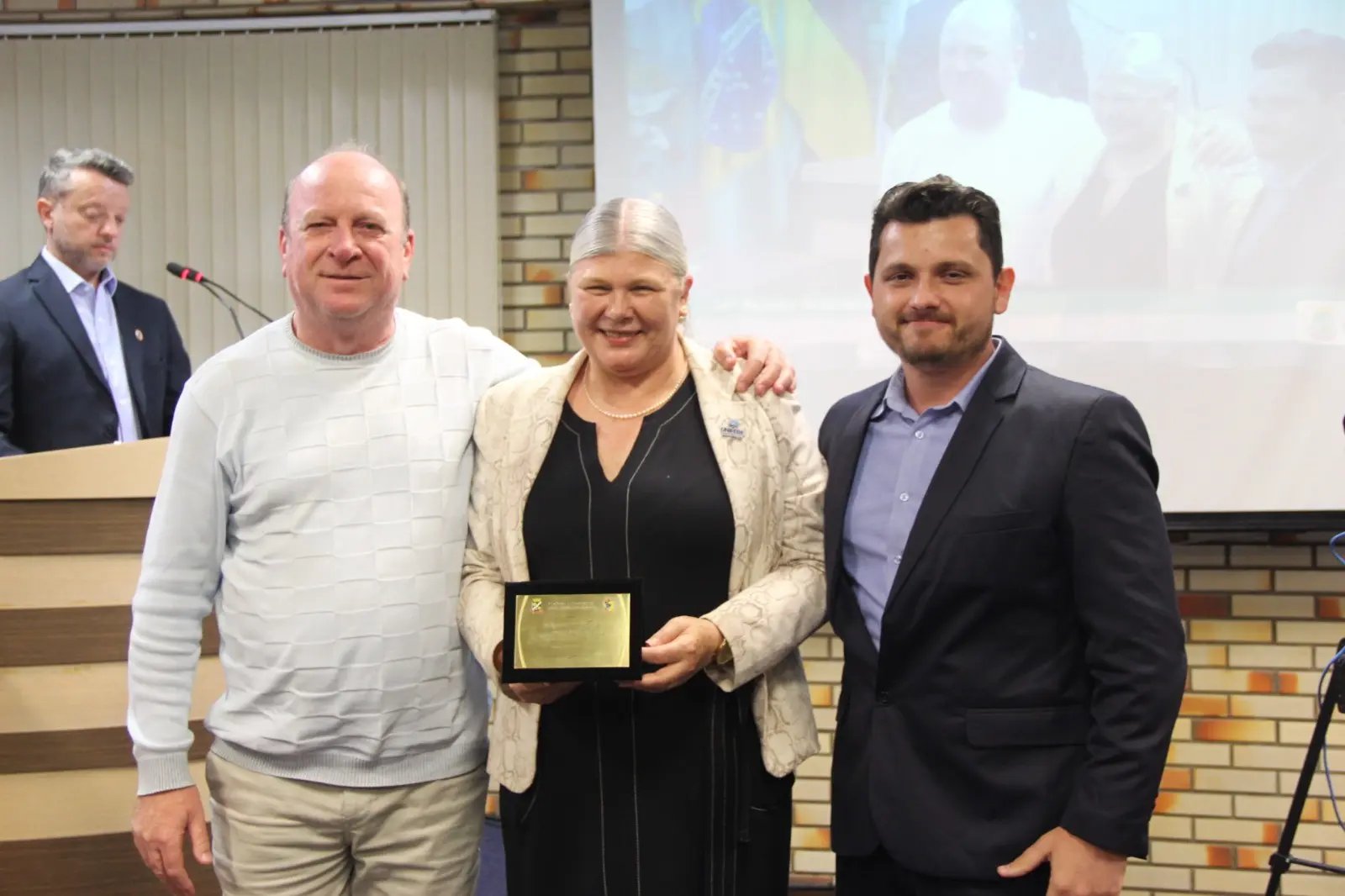 A reitora da UNIFEBE, professora Rosemari Glatz, recebeu da Câmara de Vereadores a Comenda do Mérito pela Parceria Climática entre a cidade de Brusque e o distrito de Karlsruhe. A homenagem foi concedida pelo poder legislativo brusquense nesta terça-feira (28), às lideranças e instituições que tiveram papel fundamental no convênio internacional responsável por fomentar projetos de inovação e sustentabilidade. Além da UNIFEBE, representantes alemães, das prefeituras de Brusque, Guabiruba e da Associação Catarinense de Intercâmbio e Cultura – ACIC, receberam a Comenda proposta pelo vereador Jean Pirola.