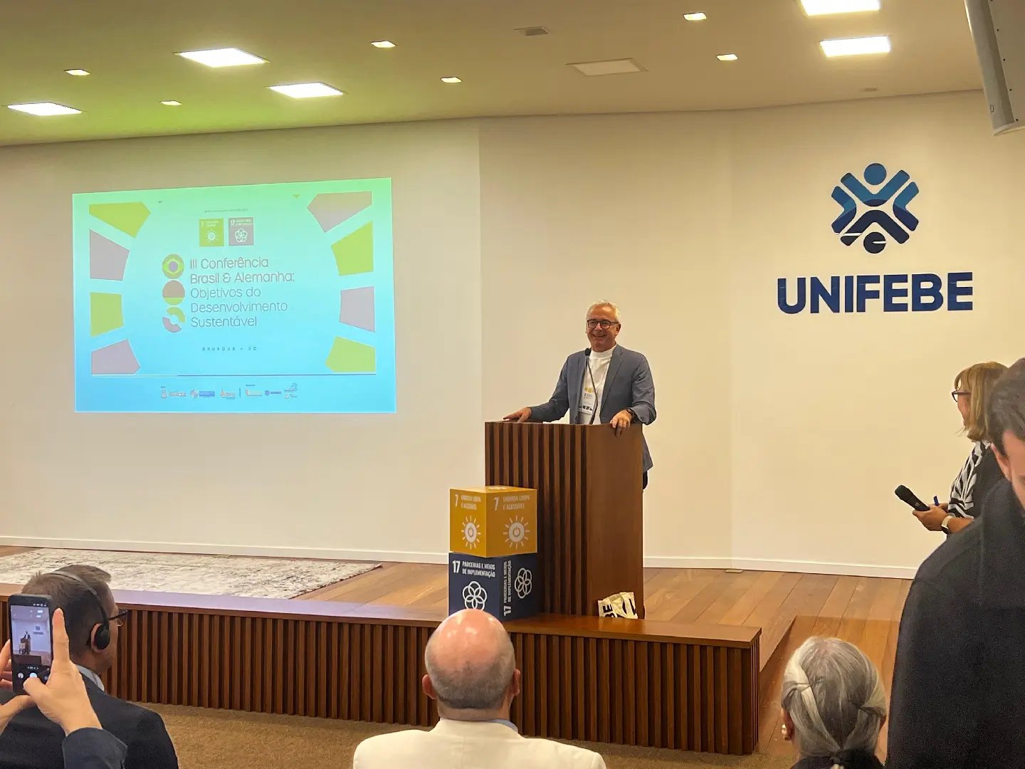 A Unifebe recebeu nesta quarta-feira (29) a visita da comitiva alemã vinda do distrito de Karlsruhe, que participa de agendas em Brusque ao longo da semana. Durante a passagem pela instituição, o grupo acompanhou as atividades da 3ª Conferência dos Objetivos de Desenvolvimento Sustentável (ODS), promovida pela universidade.