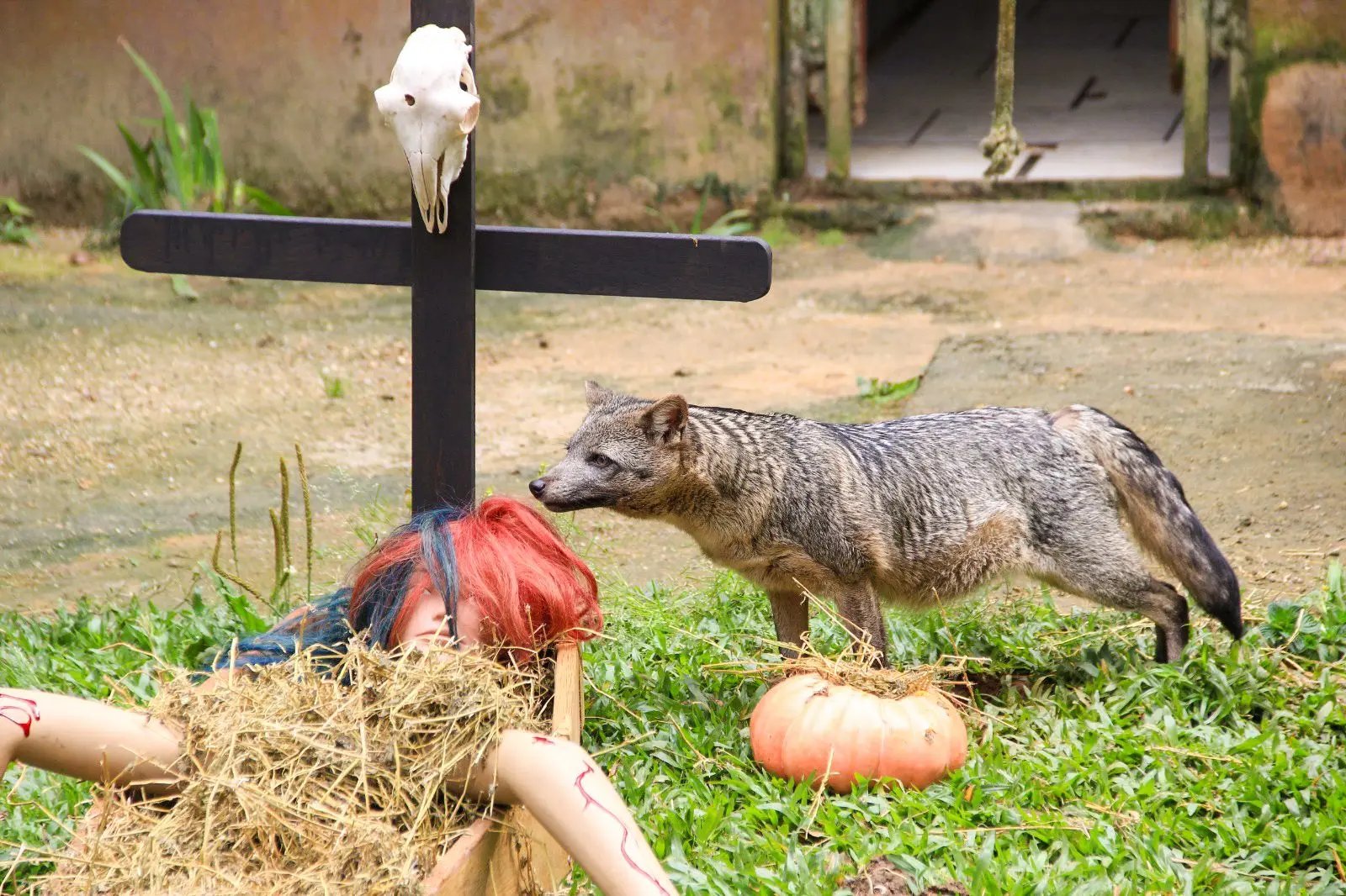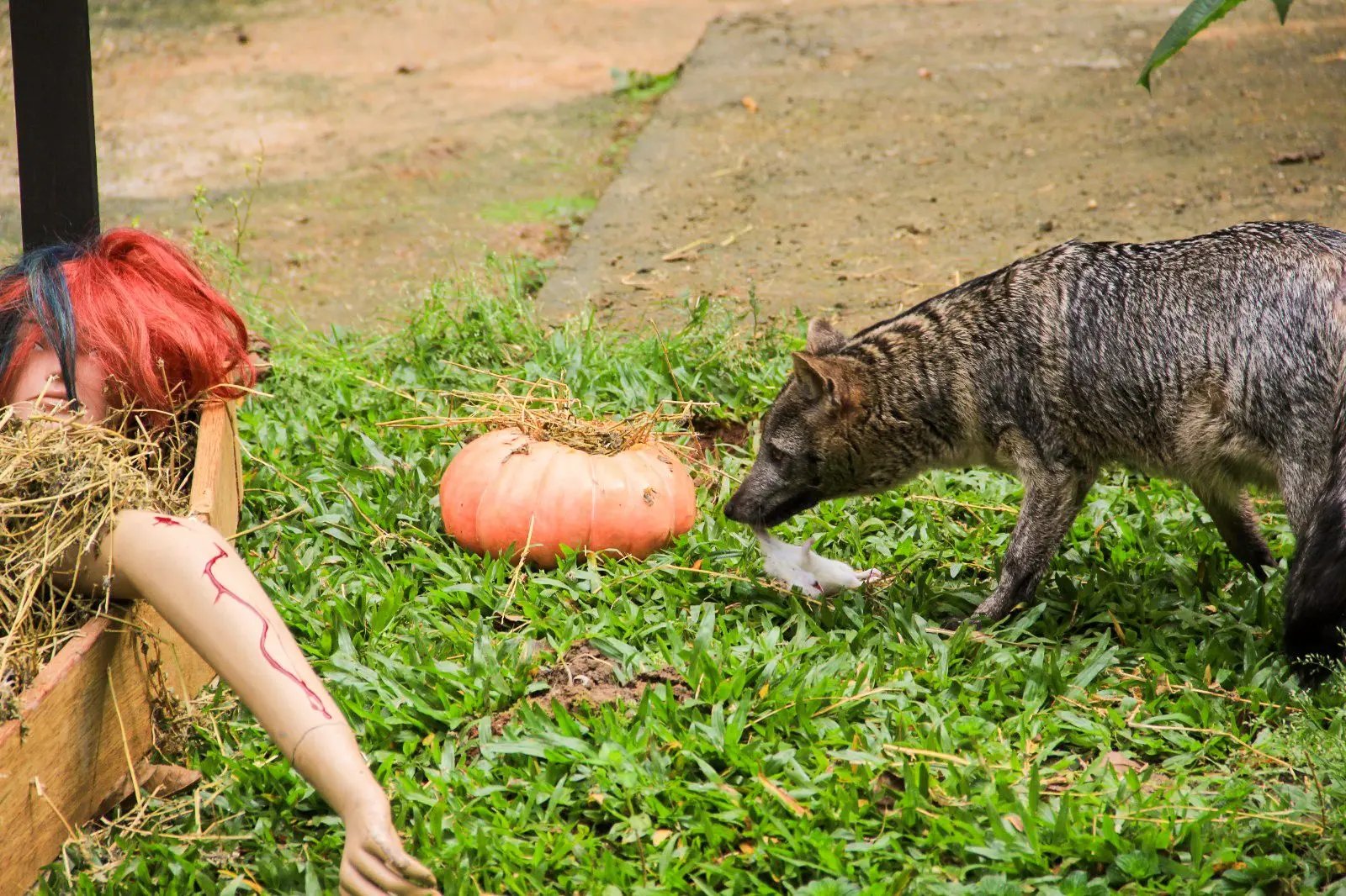 “Hoje a gente fez um enriquecimento ambiental temático com os nossos cachorros-do-mato. A equipe caprichou na decoração e escondemos alimentos dentro das abóboras. Isso deixa a atividade mais divertida para os animais e estimula o instinto natural deles de procurar a presa”,comentou a veterinária do Zoobotânico, Milene Zapalla.