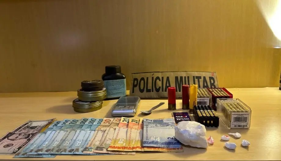 Com base nas informações de que ele mantinha armas em casa, as guarnições seguiram até a residência do homem, no bairro Arapongas, onde apreenderam 158 munições calibre .22, outras de calibres 12 e 20, além de peças de armamento, balança de precisão e embalagens usadas para o preparo da droga.