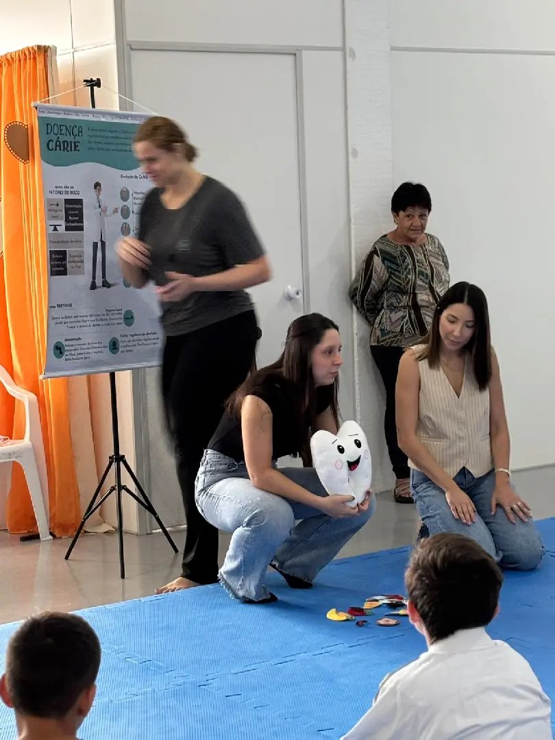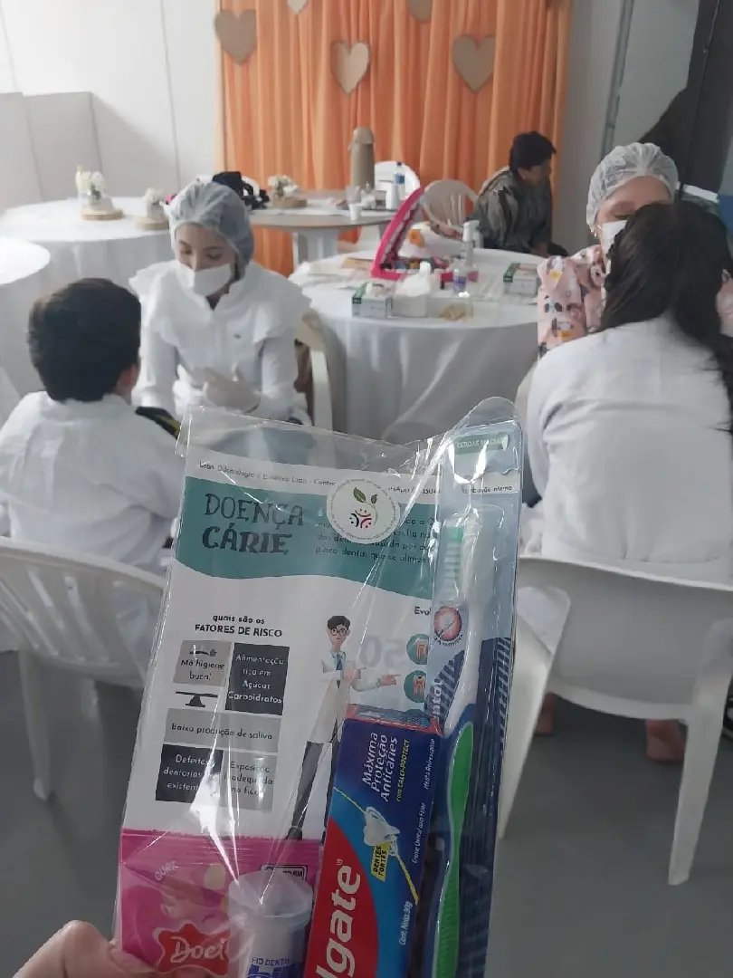 Durante o encontro, a equipe realizou uma palestra dinâmica sobre higiene bucal, com brincadeiras, sorteios e distribuição de brindes, buscando envolver os participantes de forma leve e educativa. Além disso, cada criança recebeu um kit de higiene bucal e um voucher para avaliação gratuita na clínica.