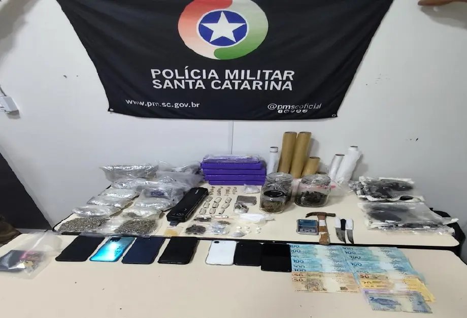 O cheiro forte de maconha vindo de um dos apartamentos levou os policiais ao ponto principal da operação. Dentro do imóvel, o cenário era de tráfico em larga escala: 8,2 quilos de maconha, 4,1 quilos de haxixe, 124 gramas de cocaína e 74 gramas de crack já estavam fracionados e prontos para venda. Também foram apreendidas três facas e um martelo com resquícios de drogas, uma balança de precisão, uma máquina de embalar a vácuo, sete rolos de papel filme e dezenas de sacos zip utilizados para o embalo.