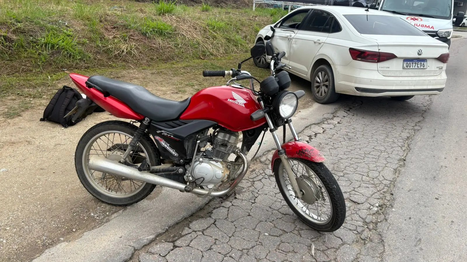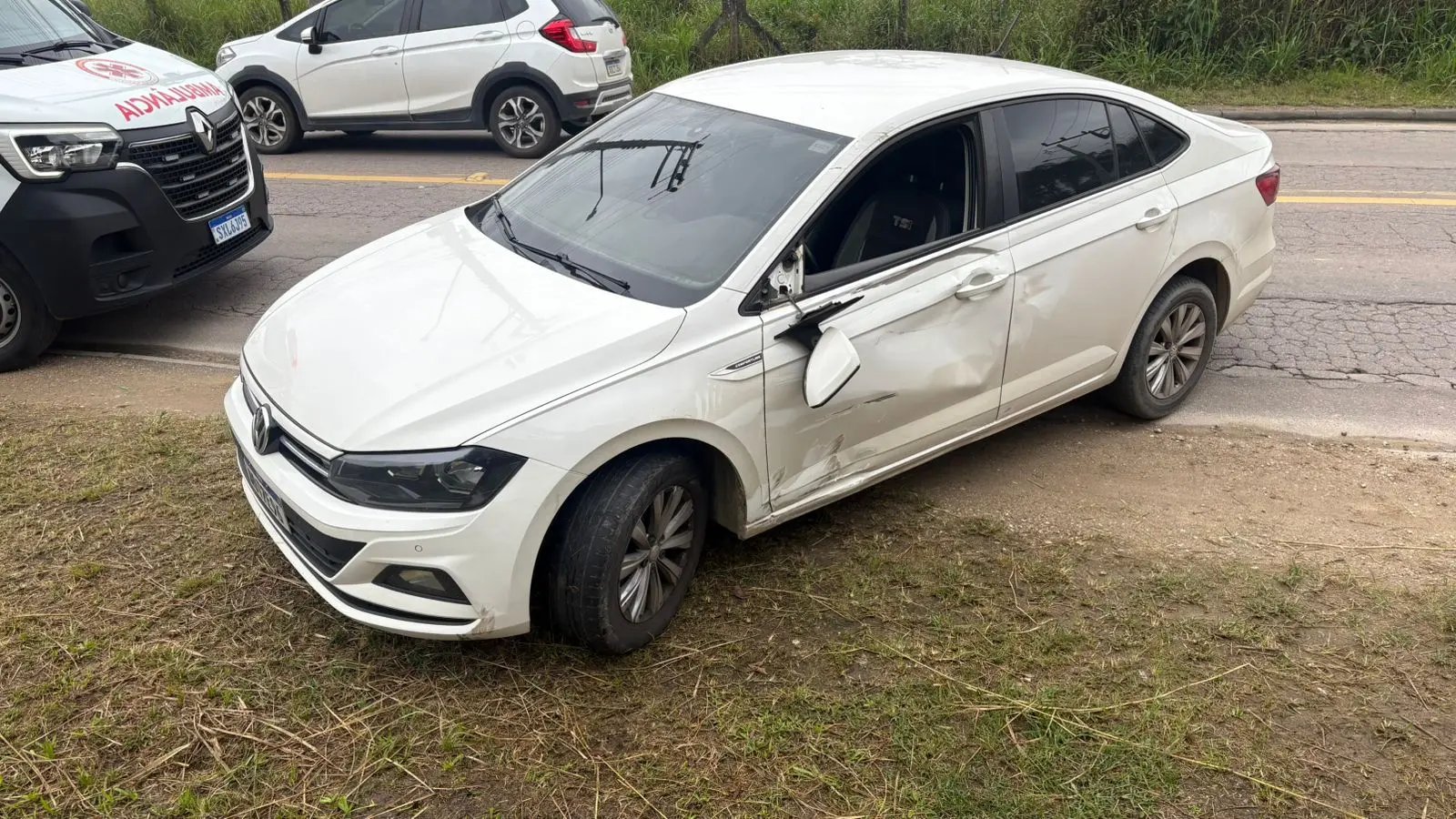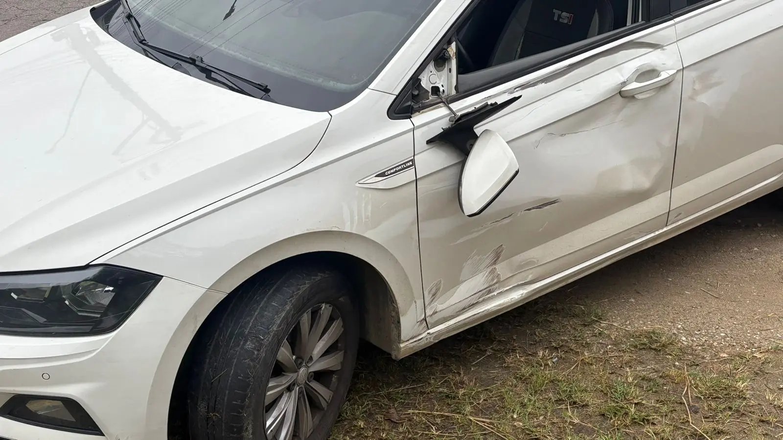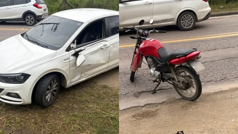 O retrovisor e a porta do motorista do Virtus ficaram danificados, e a moto acabou caindo na pista.