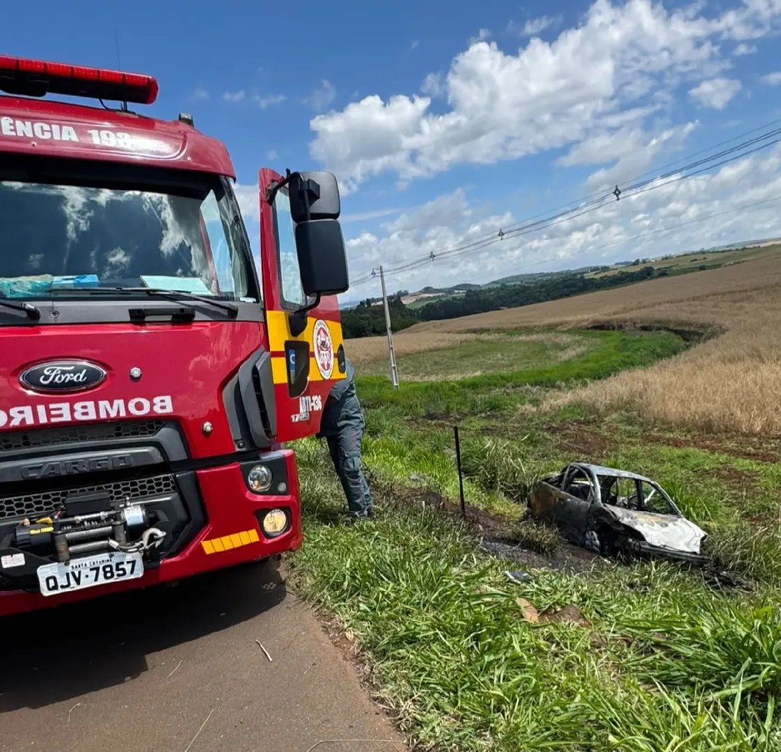 Um grave acidente deixou duas pessoas mortas na manhã desta terça-feira (4) na SC-480, em Ipuaçu, no Oeste catarinense. O carro em que as vítimas estavam capotou e pegou fogo, ficando completamente destruído às margens da rodovia.
