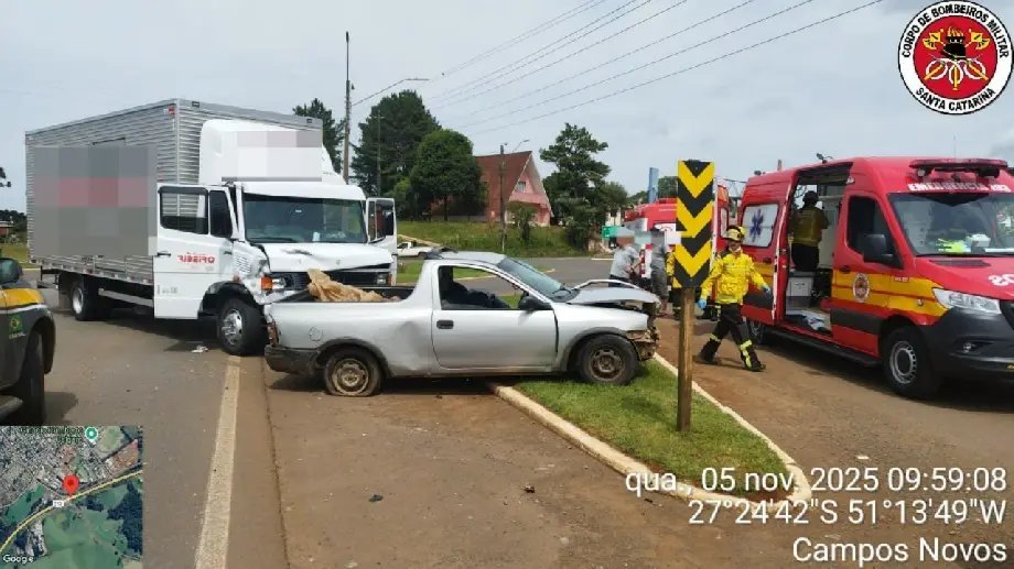 Um acidente grave envolvendo um idoso de 100 anos e um caminhão terminou em morte na manhã desta quarta-feira (5), na BR-470, em Campos Novos. O idoso estava no comando de uma picape Corsa quando colidiu na lateral de um caminhão de Lages.