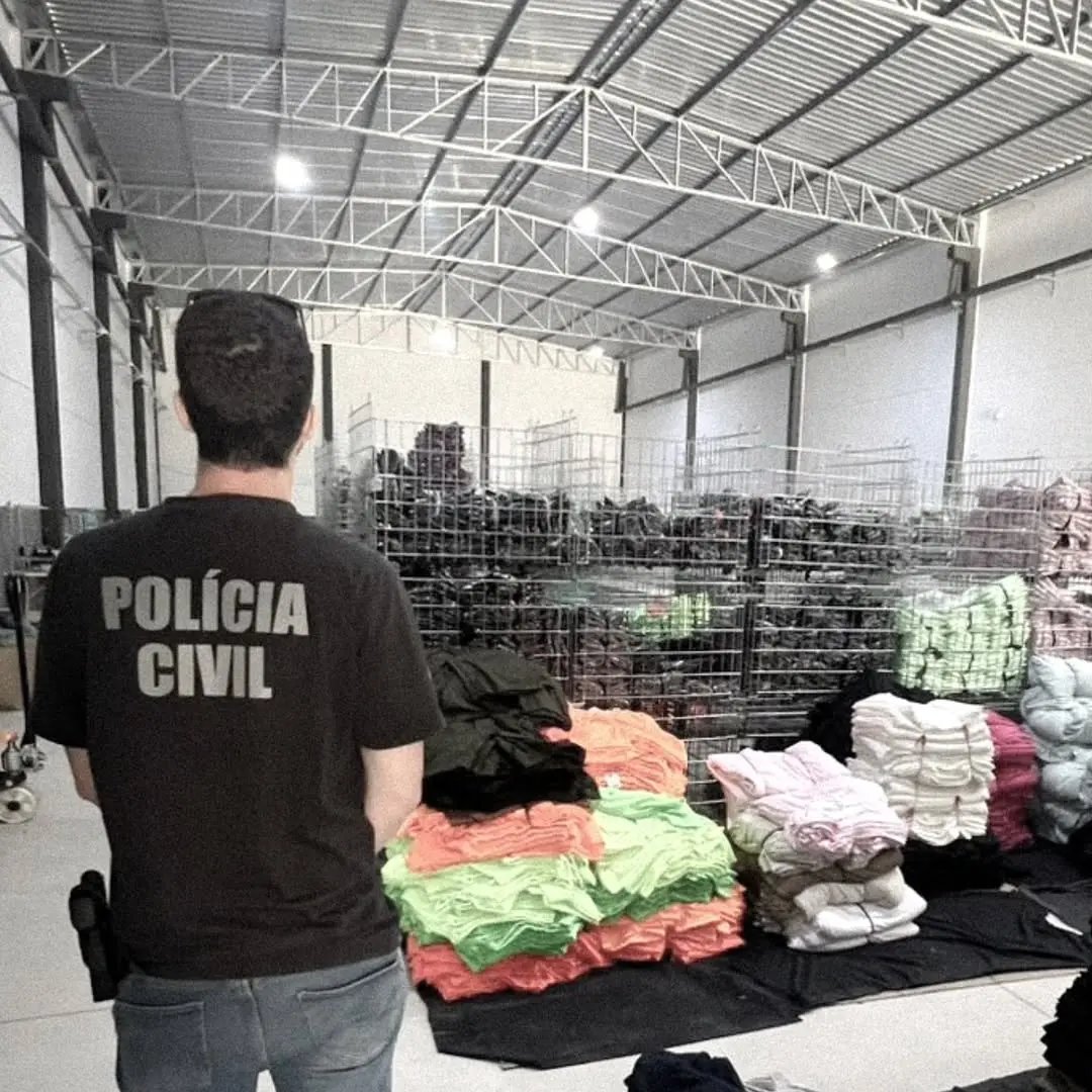 Adicionalmente, foi realizada fiscalização em estabelecimento comercial, uma loja no centro de Brusque, onde foram apreendidas aproximadamente 3.800 peças de roupas, avaliadas em R$ 150 mil.