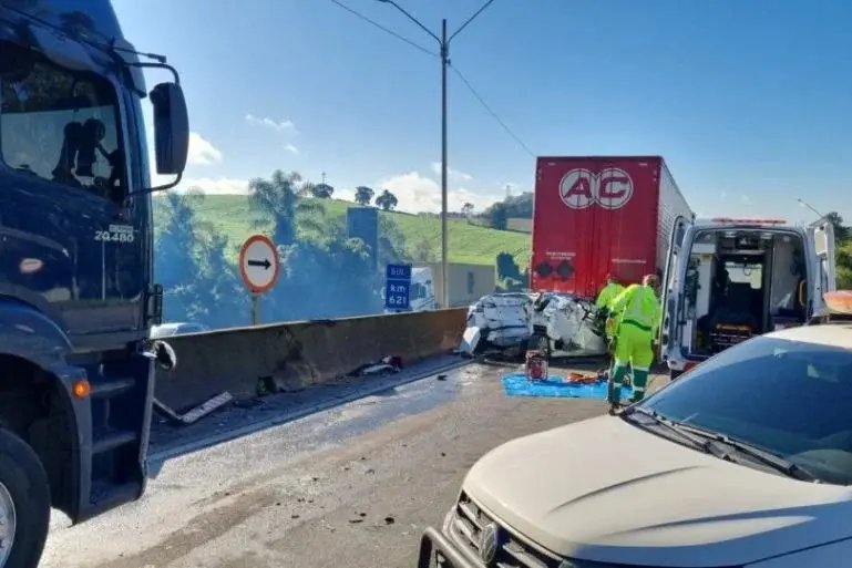 As imagens divulgadas mostram a gravidade da colisão: o automóvel aparece destruído, com a parte dianteira e traseira completamente comprimidas pelas carretas. Motoristas que passavam pela rodovia no momento ficaram impressionados com o cenário.