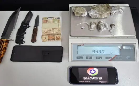 Durante a vistoria, os policiais acabaram encontrando uma pedra de crack escondida sob o tapete do motorista, além de porções de maconha distribuídas em diferentes locais do veículo, incluindo uma porção maior, de cerca de 50 gramas. Parte da droga estava até mesmo dentro do volante, em um compartimento improvisado. Além do entorpecente, os policiais apreenderam três facas, R$ 50 em espécie e um aparelho celular, itens que reforçaram a suspeita de envolvimento com o tráfico.