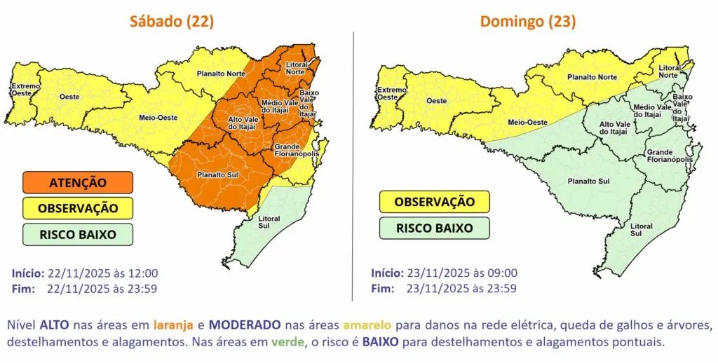 Destaca-se, ainda, que os temporais mais intensos são esperados no Vale do Itajaí, atingindo Brusque.