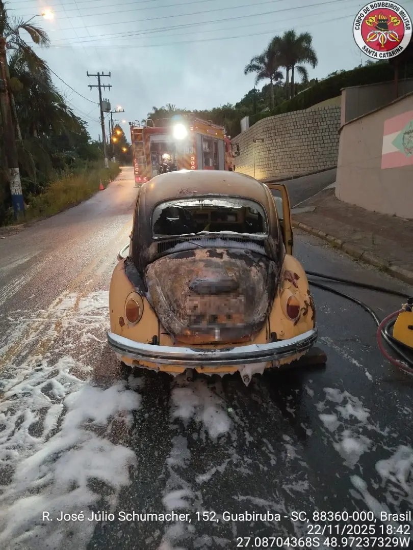 O Corpo de Bombeiros de Guabiruba atendeu, por volta das 18h14 deste sábado (22), um incêndio em veículo na Rua José Júlio Schumacher, no Centro da cidade. No local, os bombeiros encontraram um Fusca amarelo pegando fogo na parte de trás, onde fica o motor.