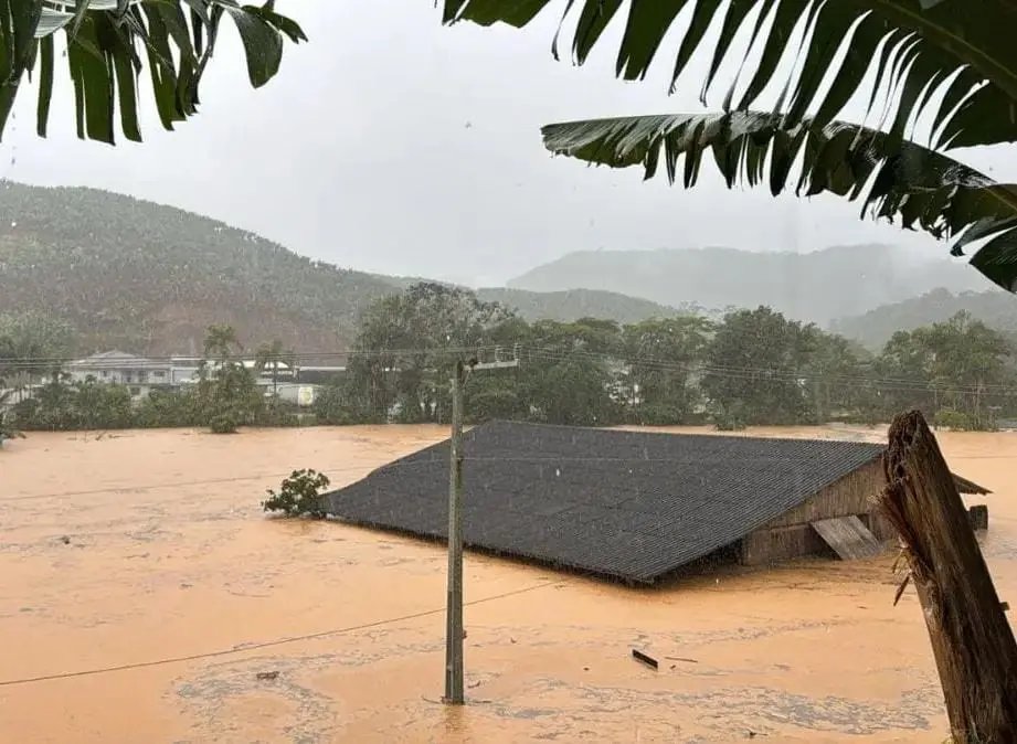 Chuvas intensas deixam ruas e casas completamente alagadas nesta segunda-feira (24). Moradores registraram cenas de bananais submersos e residências com água chegando aos telhados, em Luiz Alves, no Vale do Itajaí.