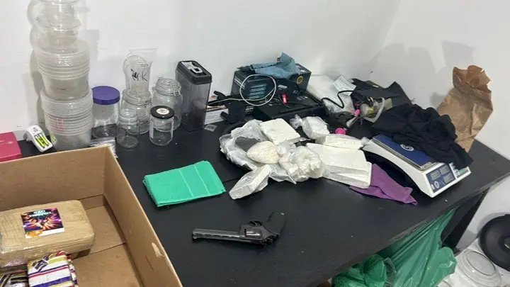 Na busca realizada no interior do imóvel, os policiais encontraram expressiva quantidade de drogas, dinheiro, uma arma de fogo e diversos equipamentos utilizados para preparo e armazenamento dos ilícitos. Foram apreendidos um revólver calibre 38 municiado com seis munições intactas; R$ 6.843,00 em dinheiro; seis balanças de precisão; duas prensas hidráulicas; além de embalagens para fracionamento.