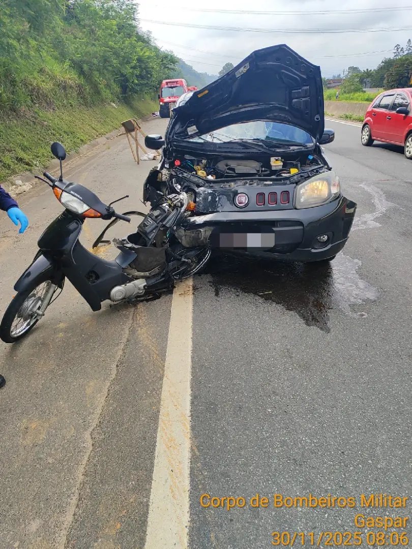 Dois homens perderam a vida em um acidente de trânsito registrado na manhã deste sábado (30), na BR-470, em Gaspar. A colisão envolveu um carro e uma motocicleta e aconteceu por volta das 7h46, no km 41 da rodovia, no bairro Belchior Baixo.