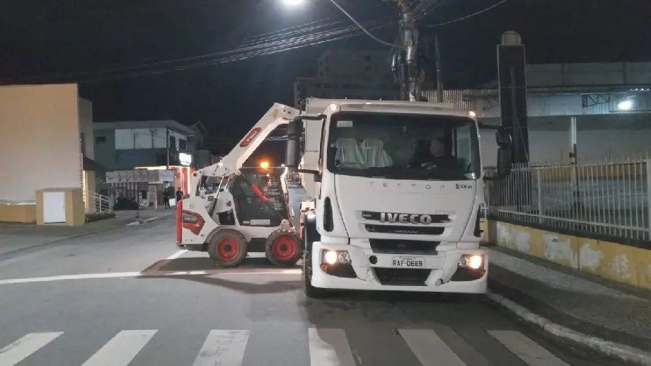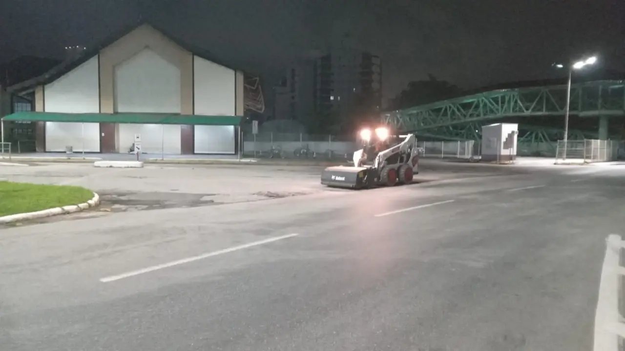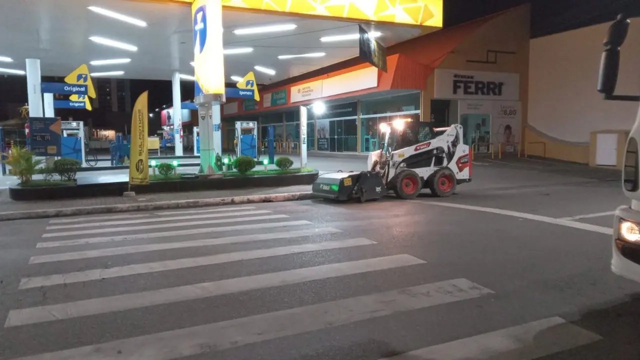 Além da limpeza diurna, a Secretaria de Obras também mantém uma equipe em operação durante a noite. Nesse período, o serviço é realizado com a mini carregadeira equipada com a varredeira acoplável, acompanhada de um caminhão para recolhimento dos resíduos. O trabalho noturno é executado por três servidores, ampliando o alcance das ações e reduzindo os transtornos no trânsito.